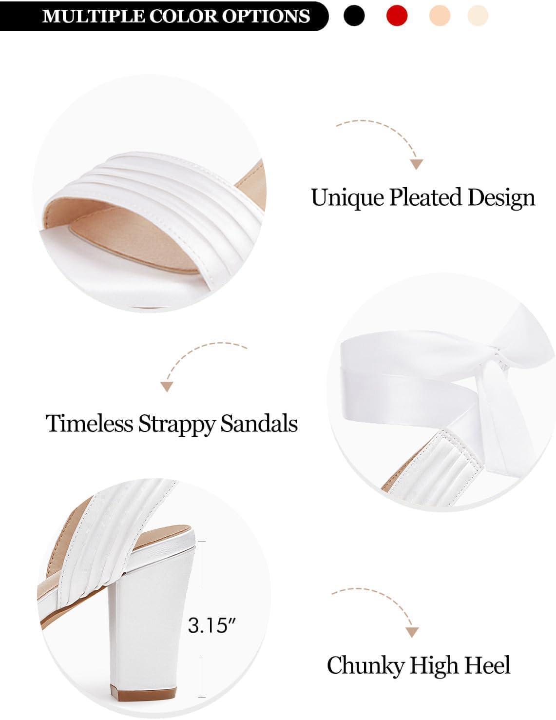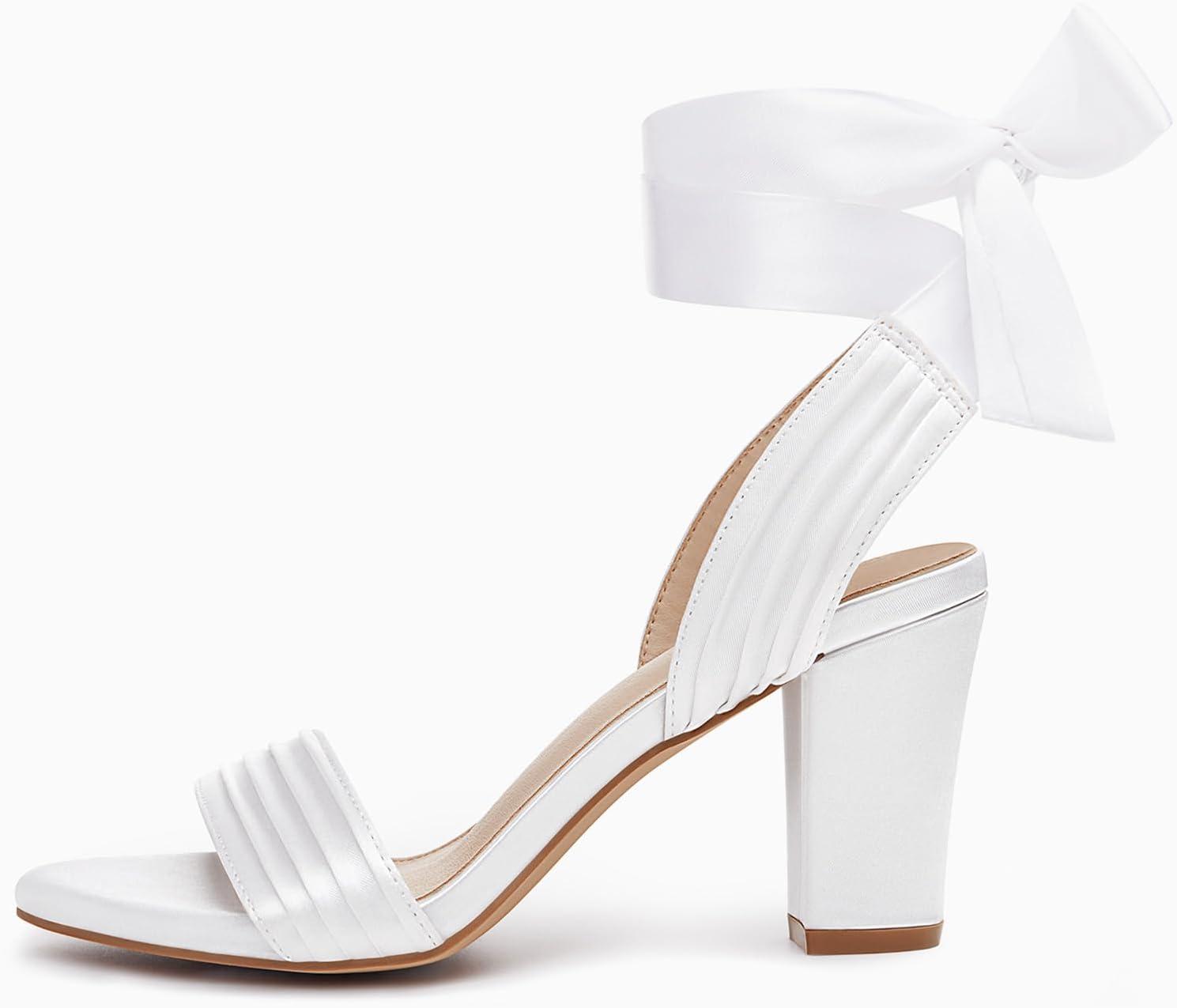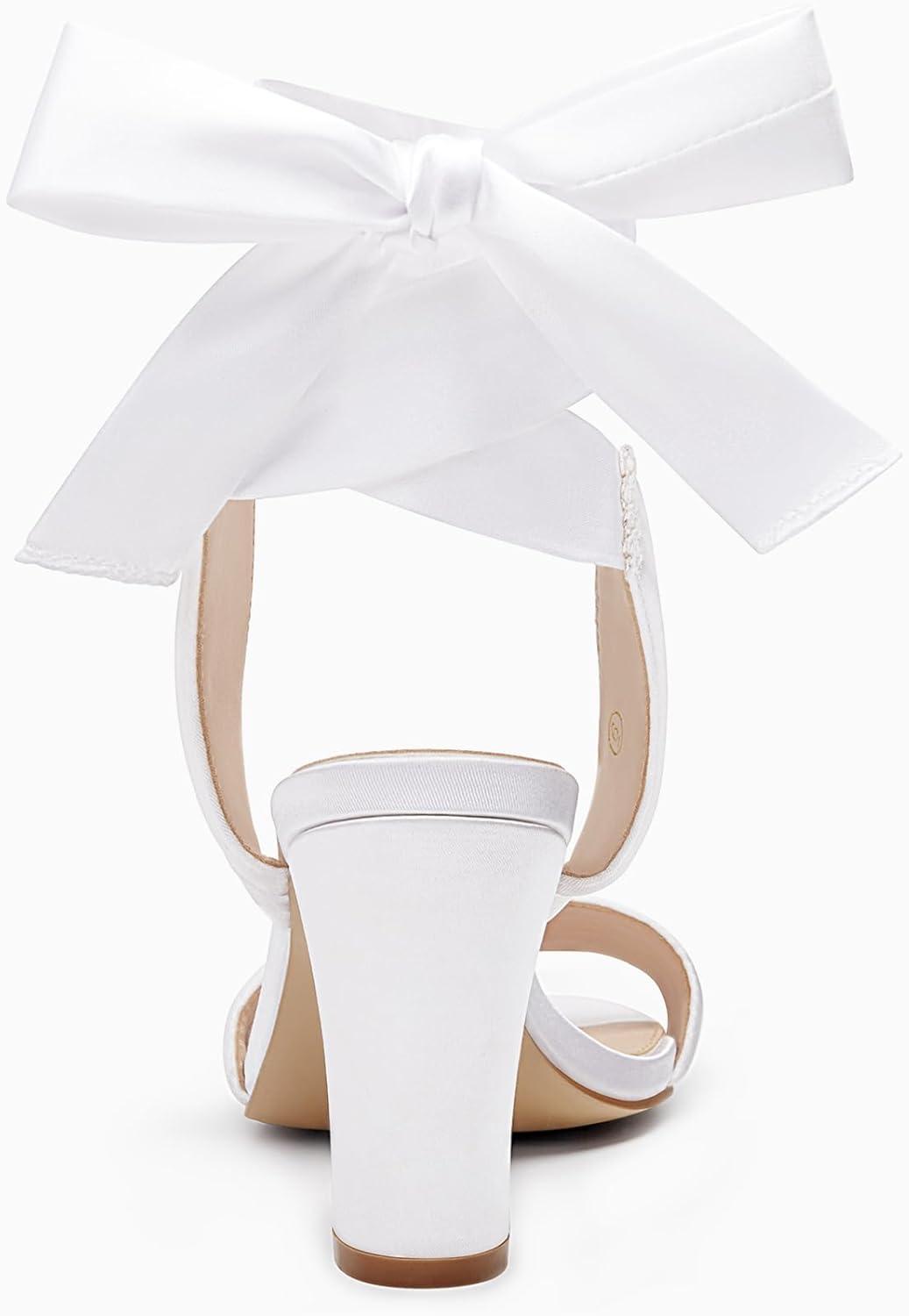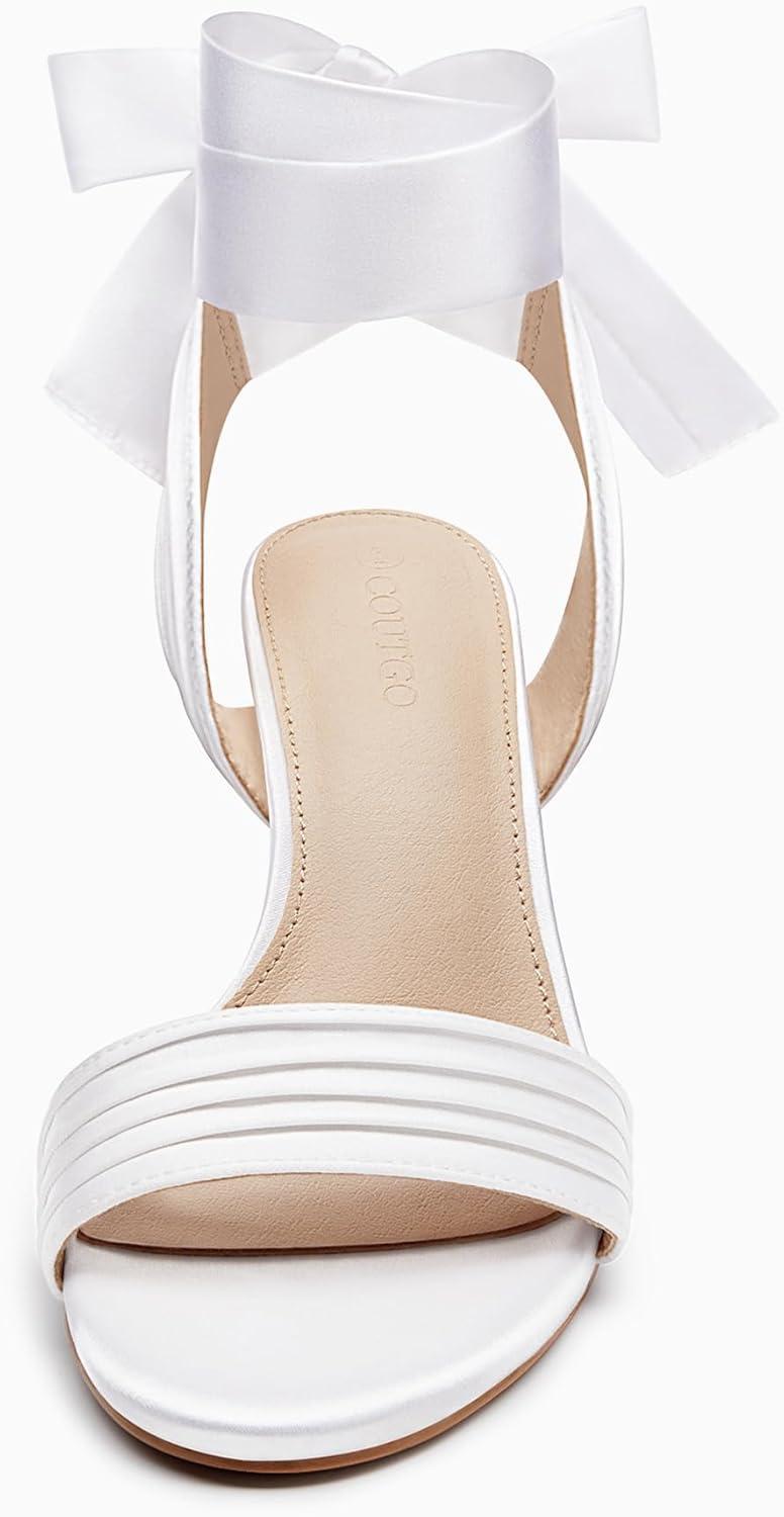 Coutgo Womens Strappy High Heels Chunky Heeled Sandals Bow Tie Lace Up Open Toe Pumps Dress Wedding Comfortable Shoes(White Satin)