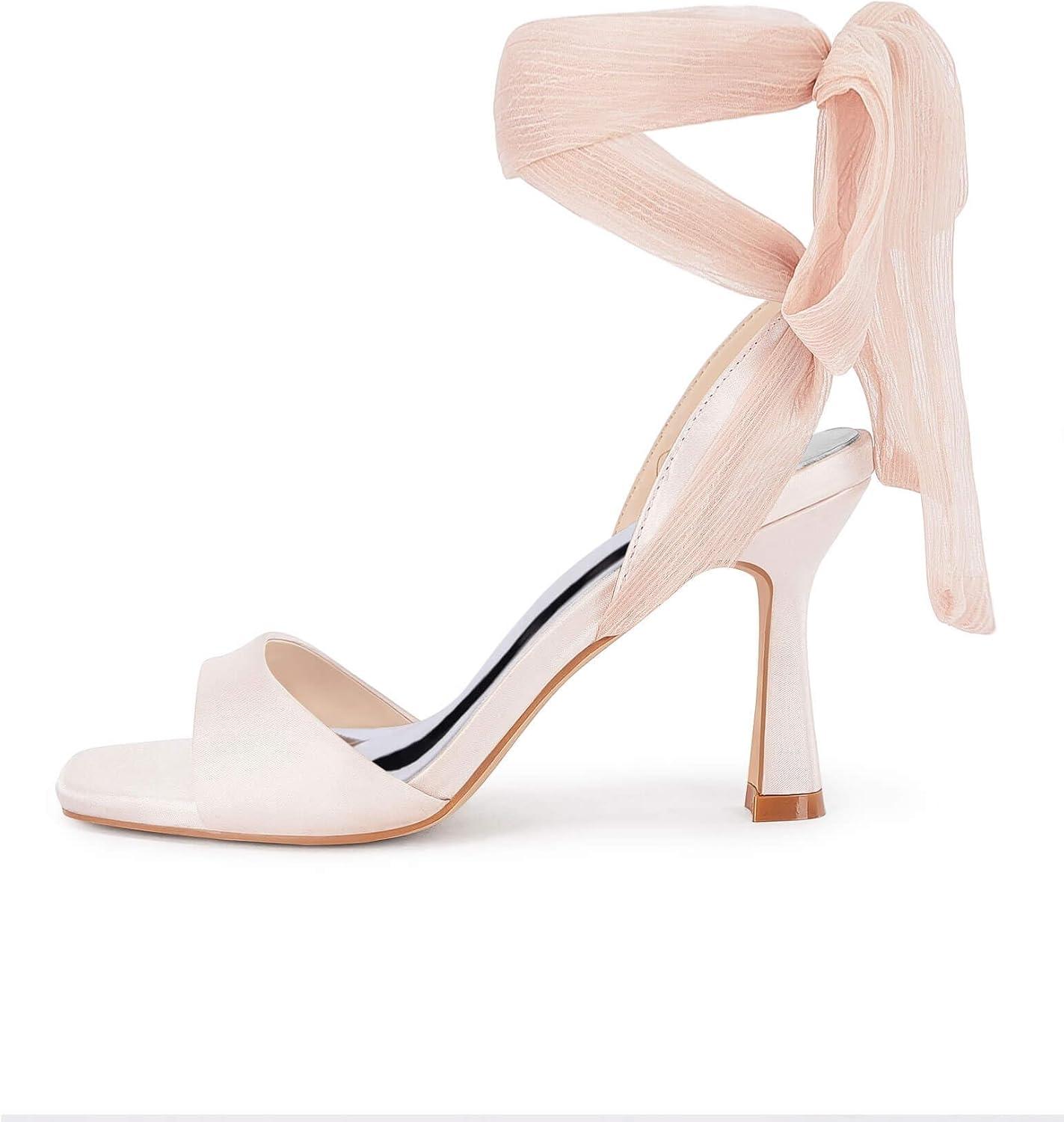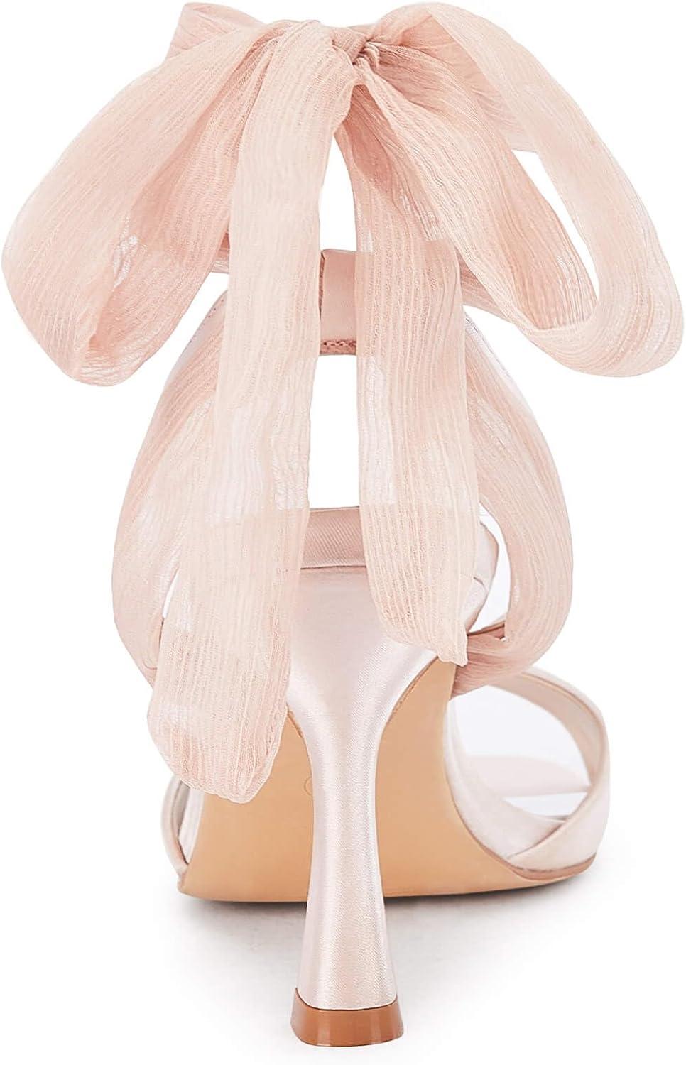 Coutgo Womens Strappy Kitten Heels Sandals Lace Up Square Open Toe High Heels Satin Summer Dress Shoes