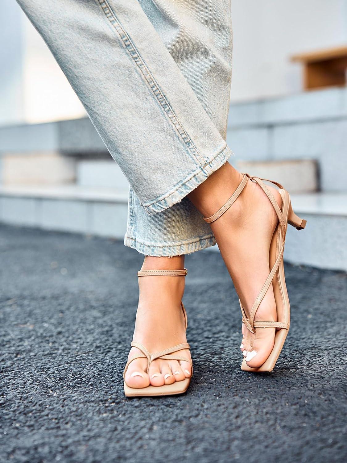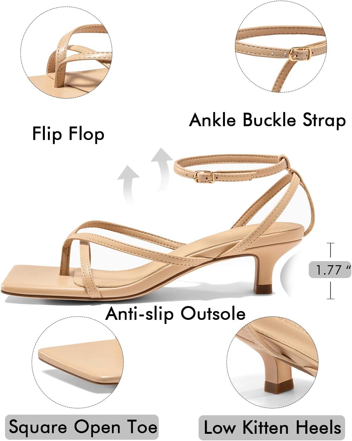Coutgo Womens Strappy Low Kitten Heels Sandals Open Square Toe Flip Flop Summer Dress Party Shoes(Nude)