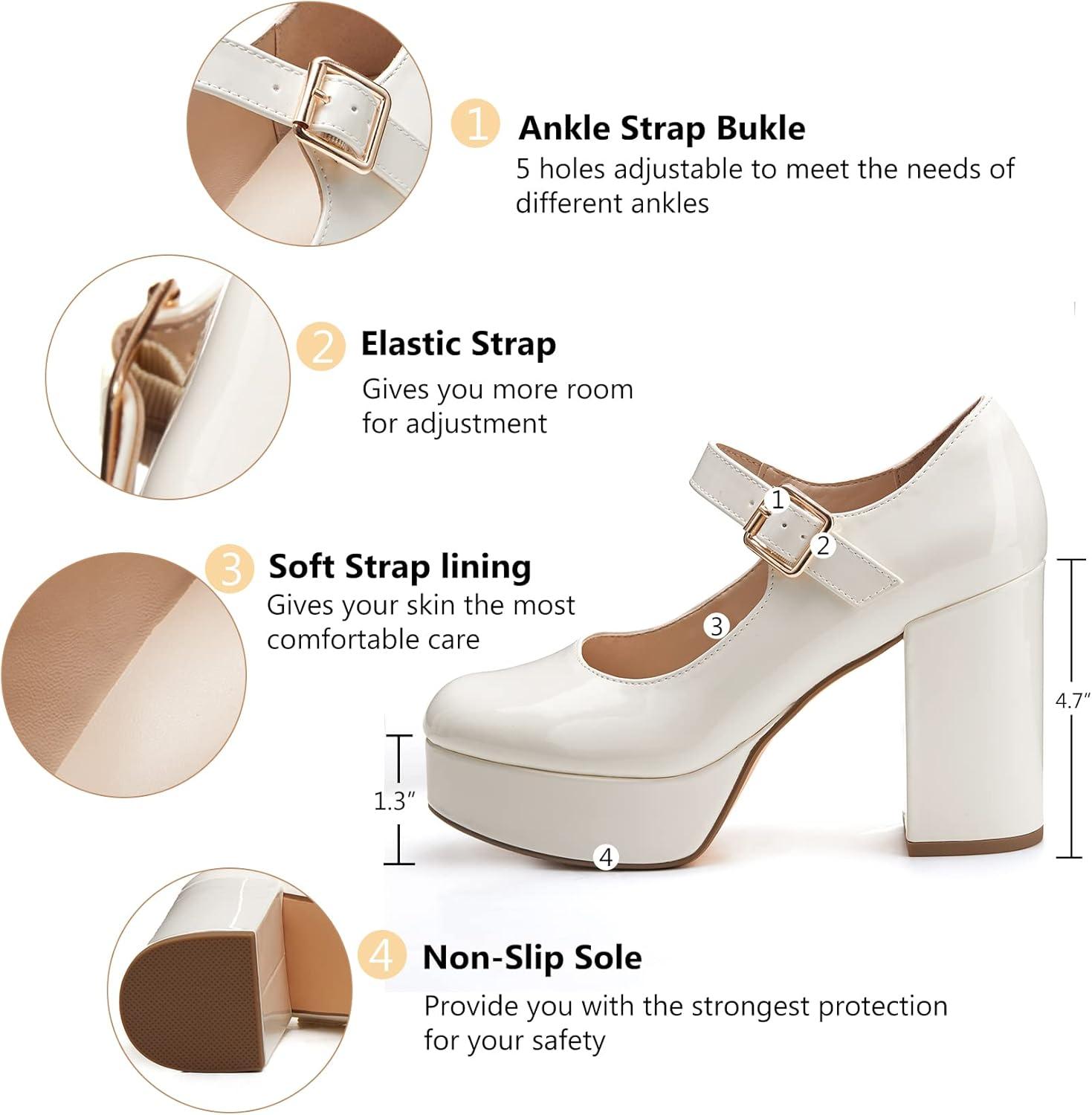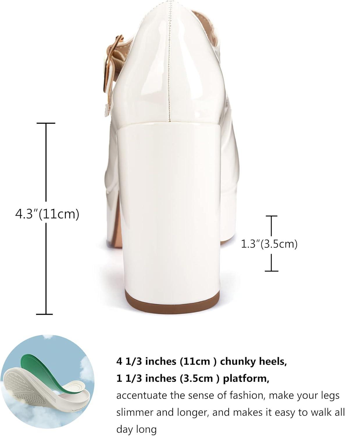 Coutgo Womens’ T-Strap Round Toe Chunky Platform Heels Patent Mary Jane Dress Shoes(Creamy White)