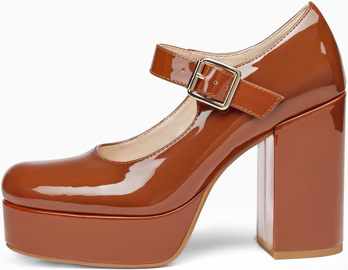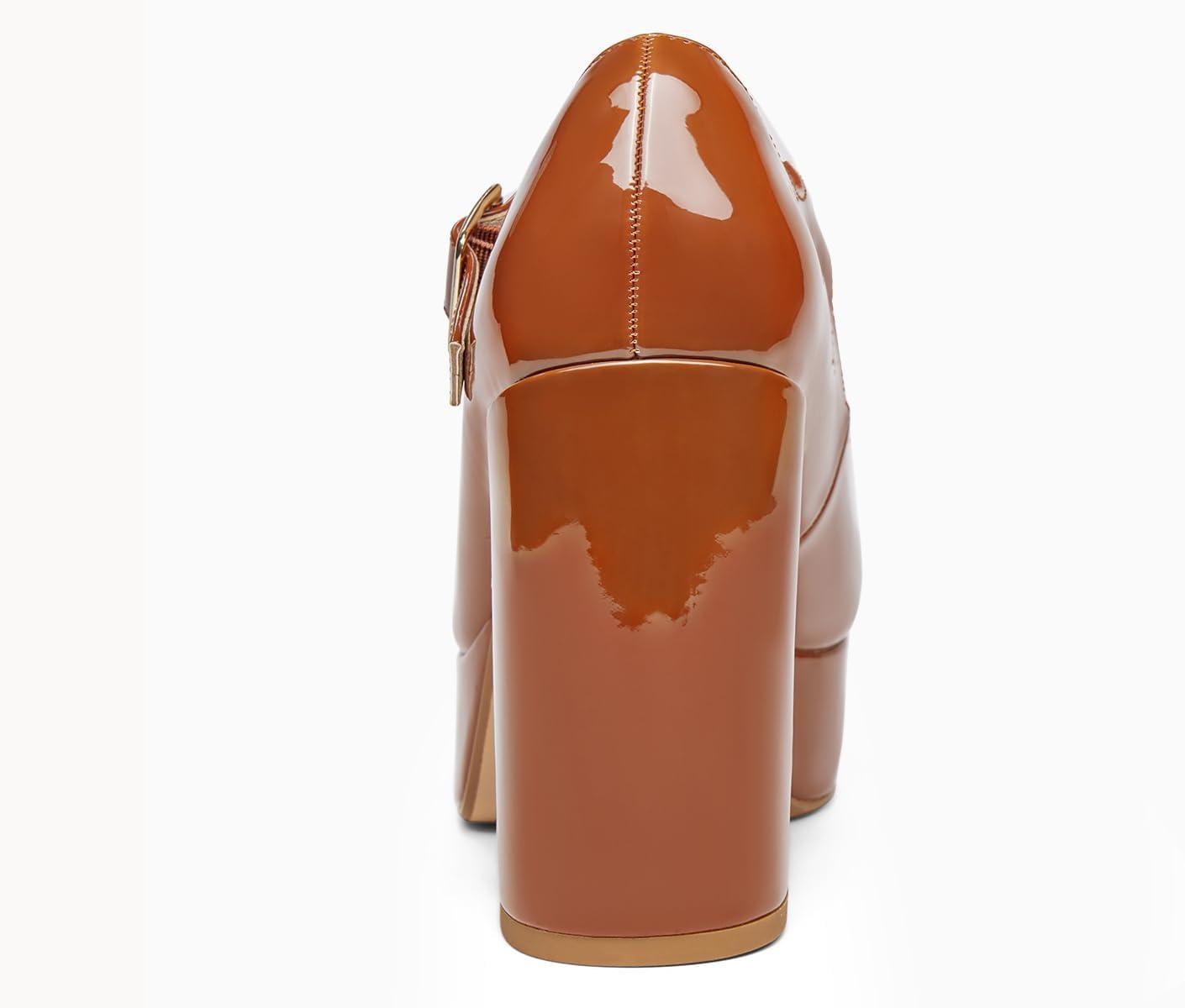 Coutgo Womens’ T-Strap Round Toe Chunky Platform Heels Patent Mary Jane Dress Shoes(Light Brown)