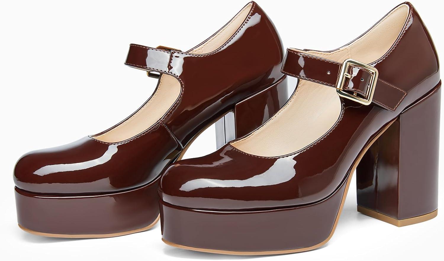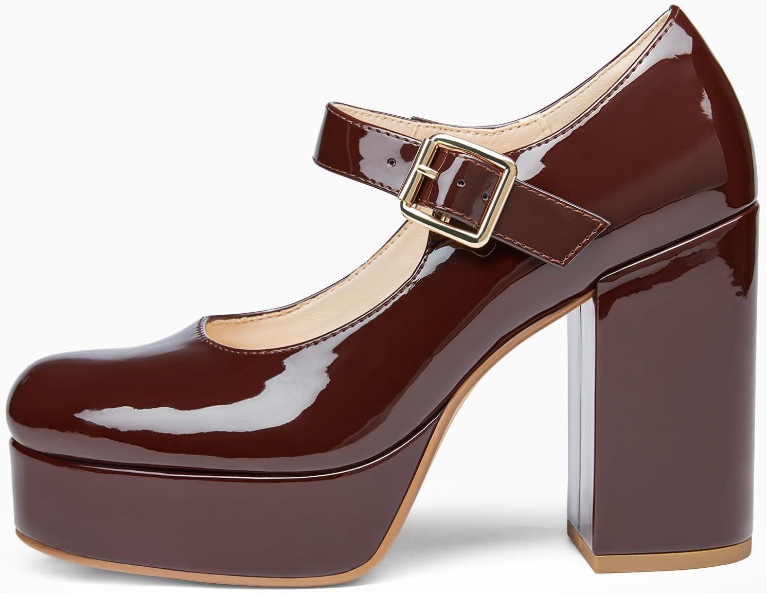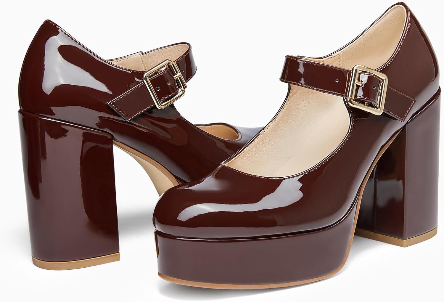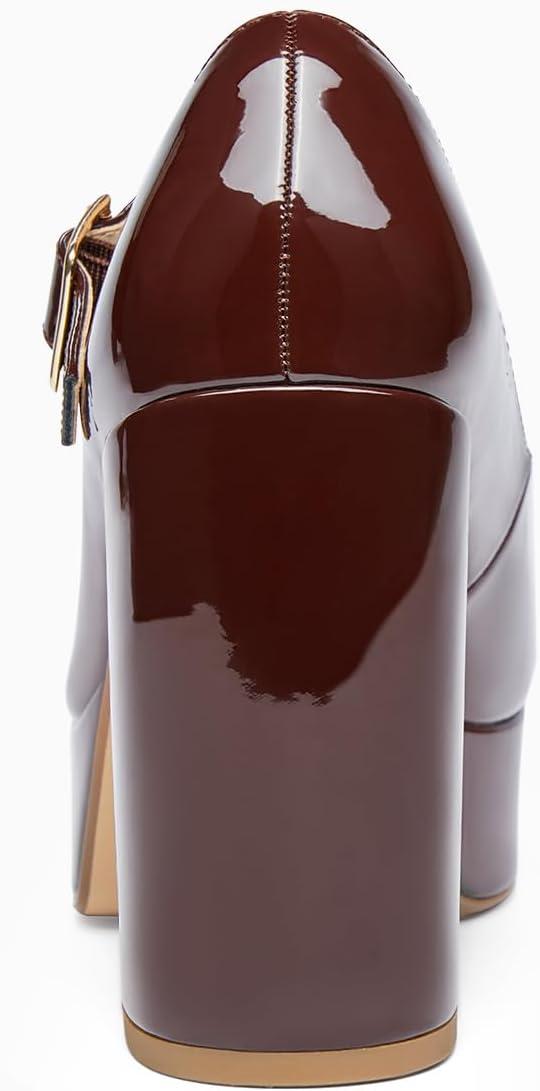 Coutgo Womens’ T-Strap Round Toe Chunky Platform Heels Patent Mary Jane Dress Shoes(Red-brown)