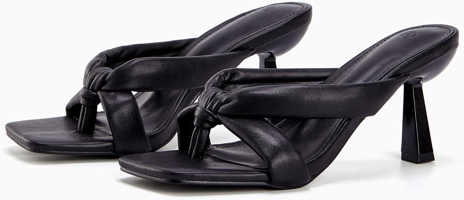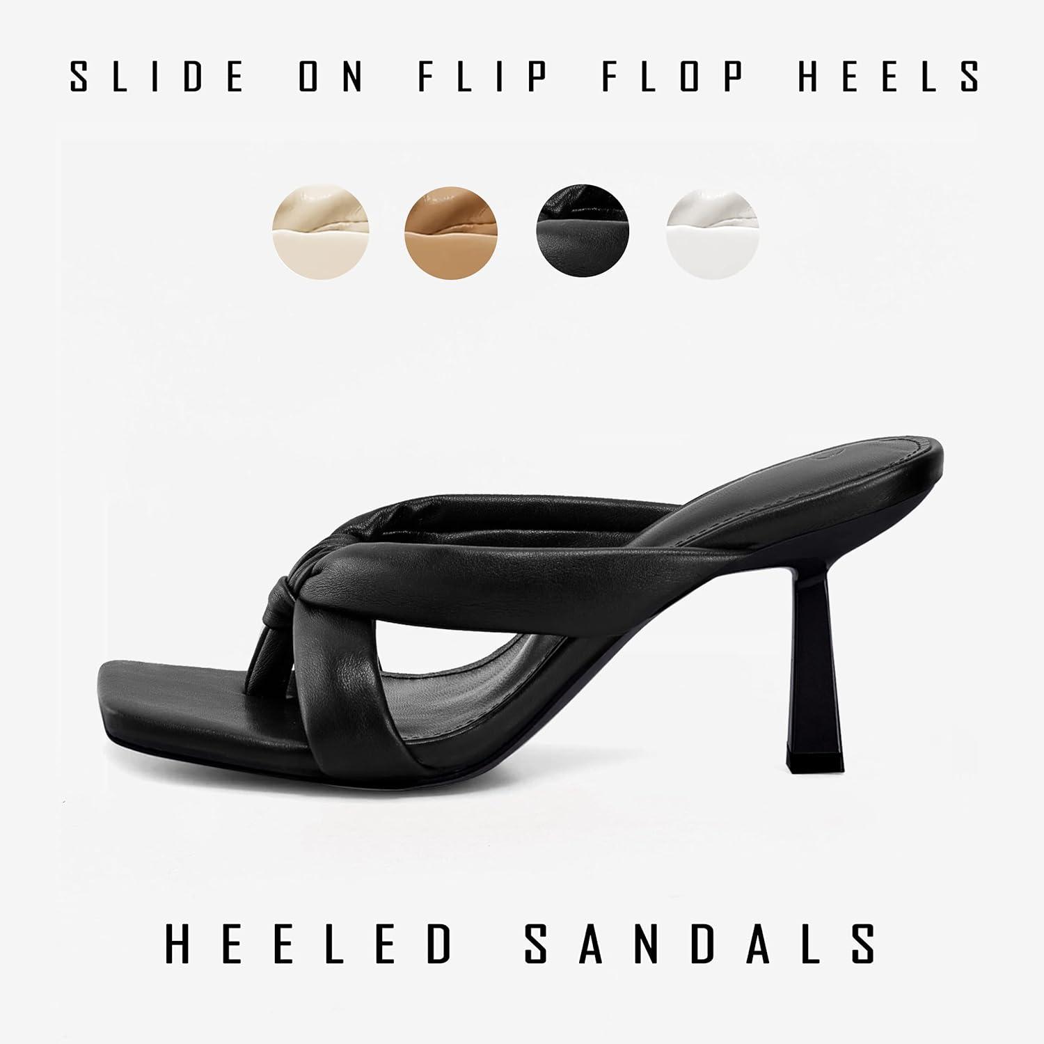 Coutgo Womens Thong Heels Mules Square Toe Heeled Flip Flops Mule Sexy Stiletto Dress Party Sandals(Black)