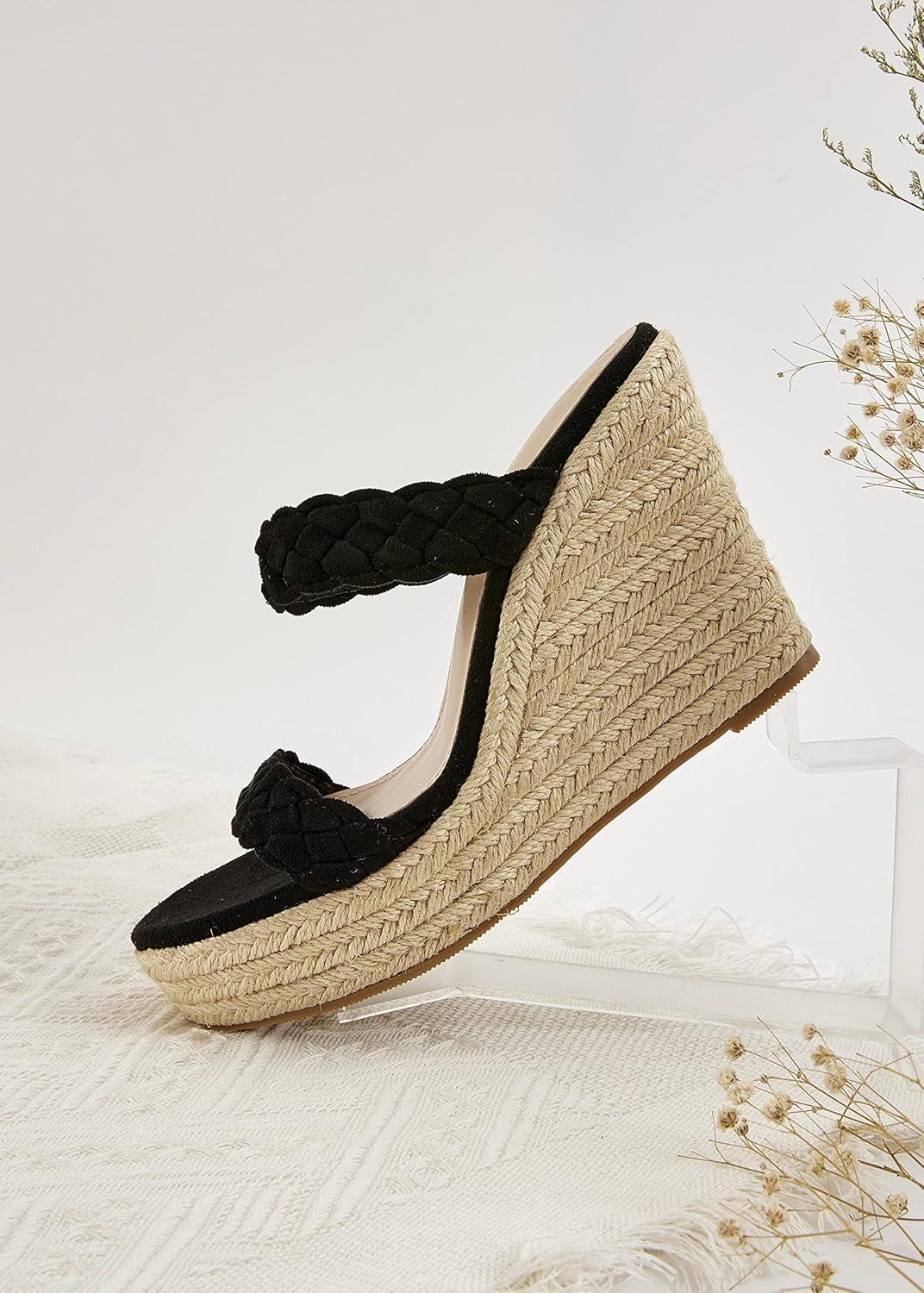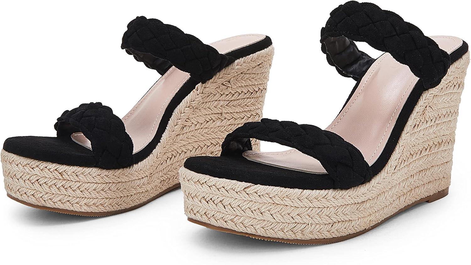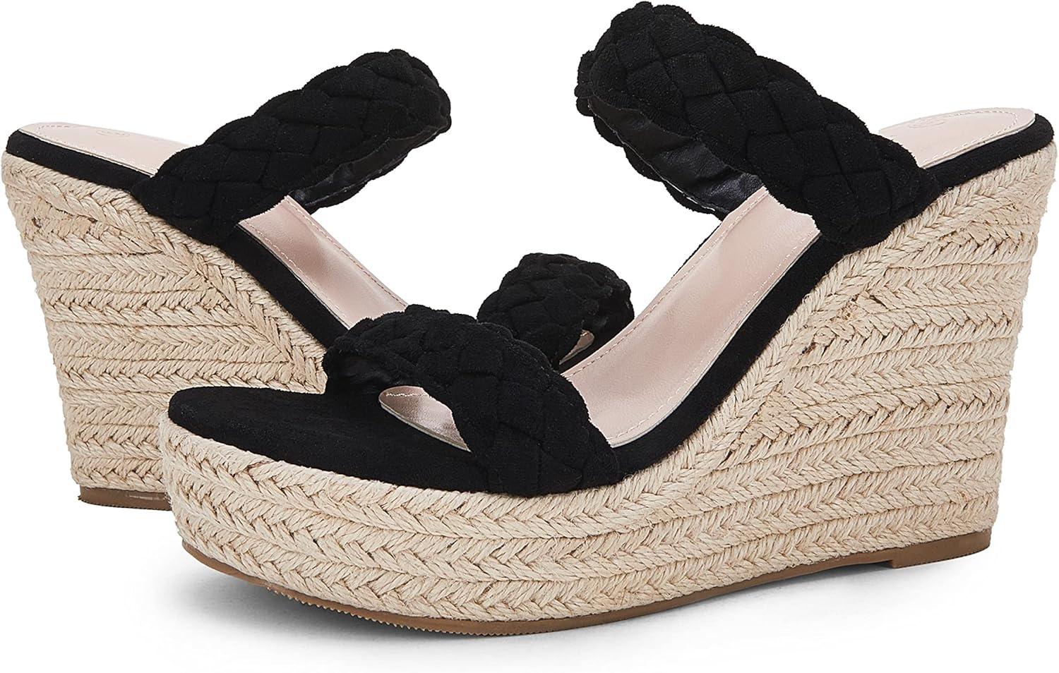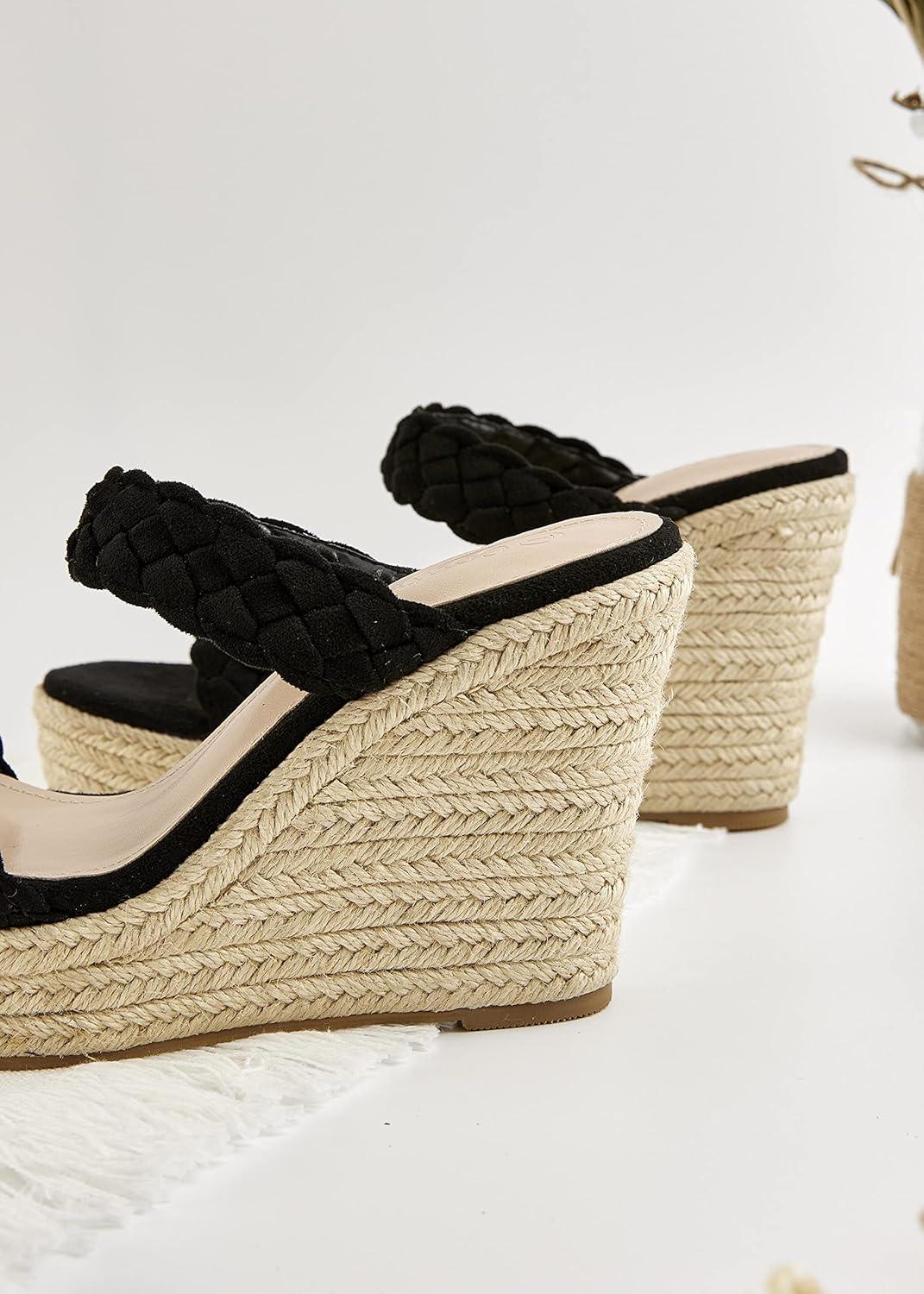 Coutgo Womens Wedge Platform Sandals Espadrilles Two Strap Woven Slip On Summer Cute Slide Sandals(Black)