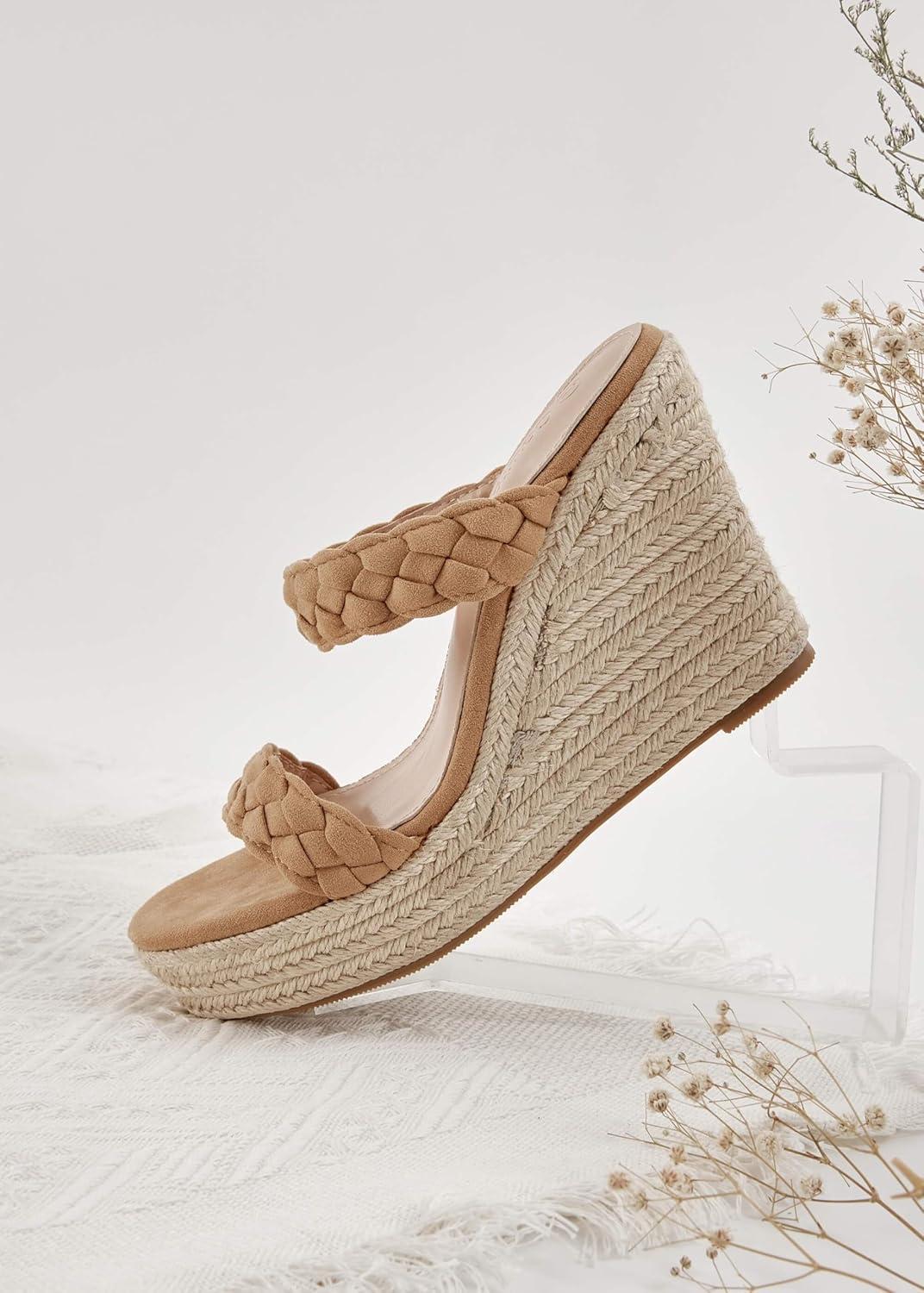 Coutgo Womens Wedge Platform Sandals Espadrilles Two Strap Woven Slip On Summer Cute Slide Sandals(Khaki)