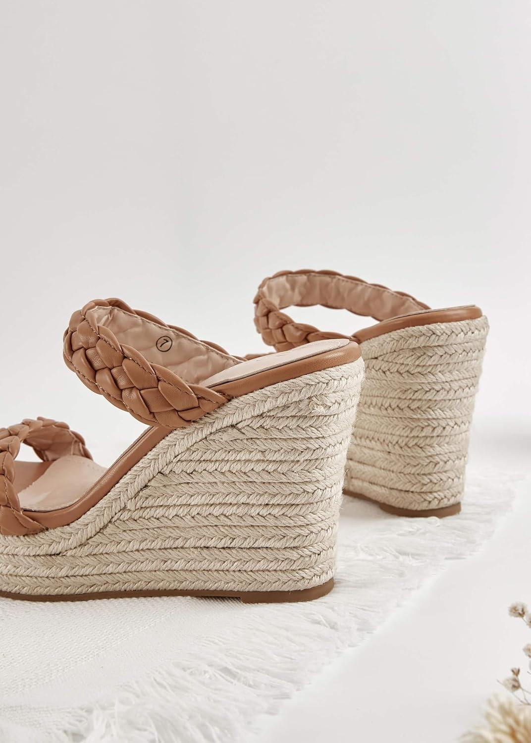 Coutgo Womens Wedge Platform Sandals Espadrilles Two Strap Woven Slip On Summer Cute Slide Sandals(Light Brown)