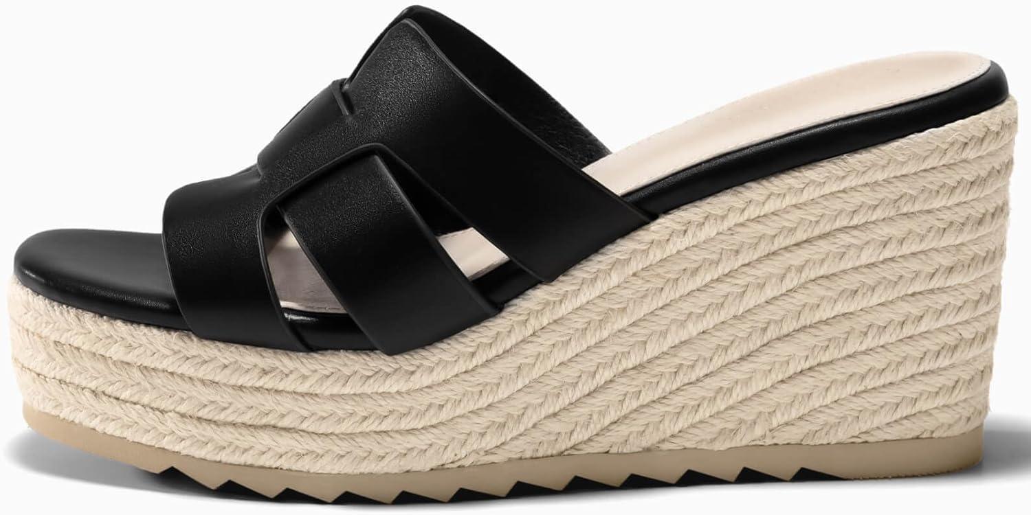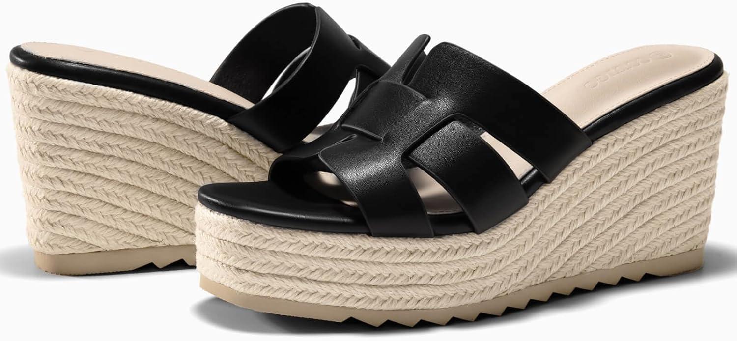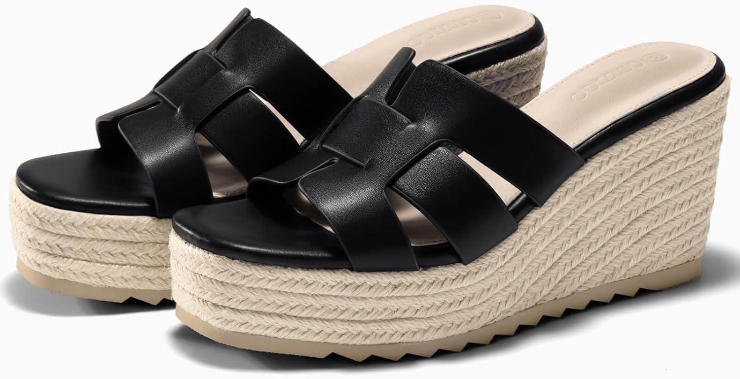 Coutgo Women’s Wedge Sandals Platform Espadrille Heels Open Toe Strappy Slip On Casual Summer Slide Shoes(Black)