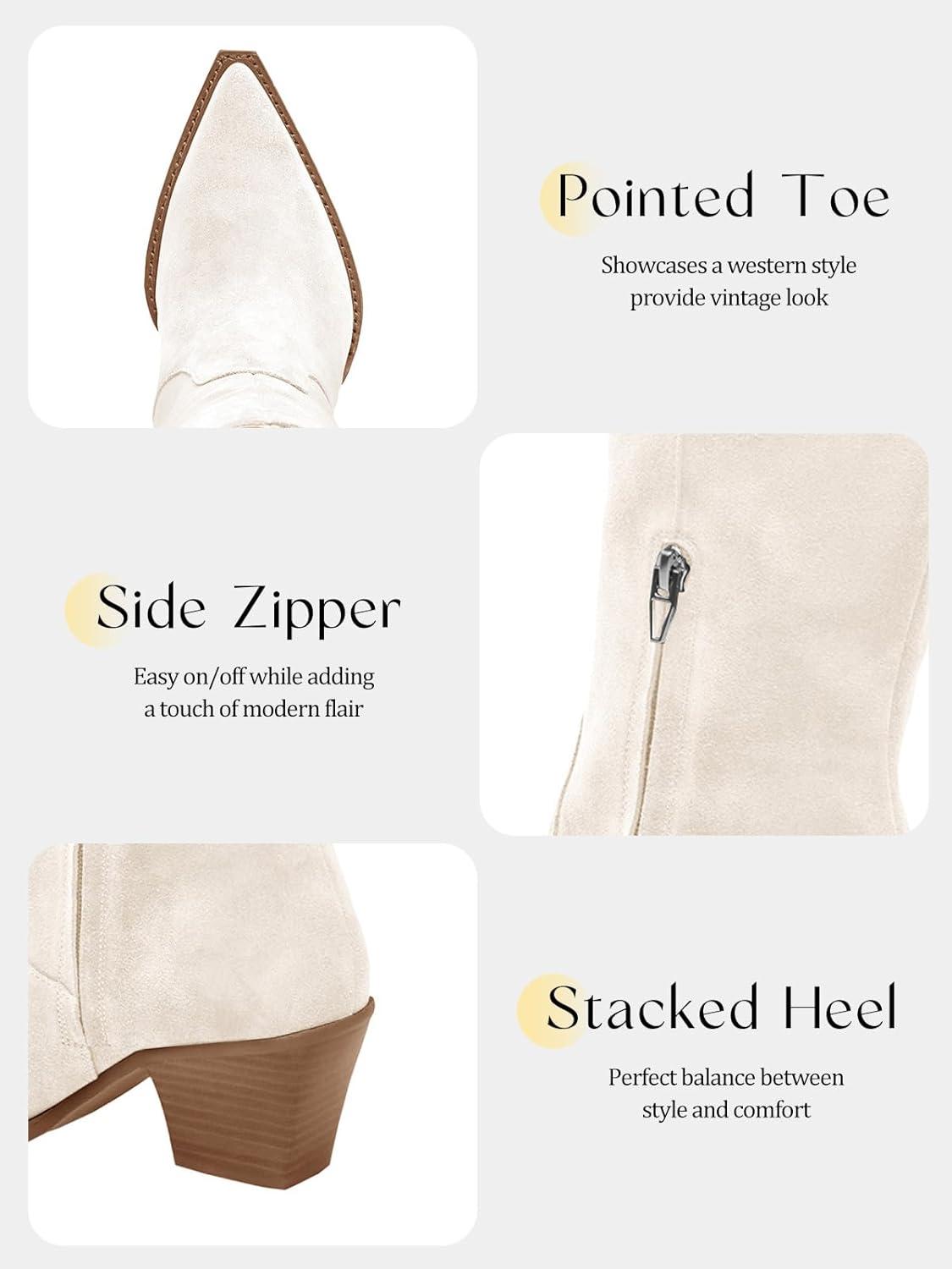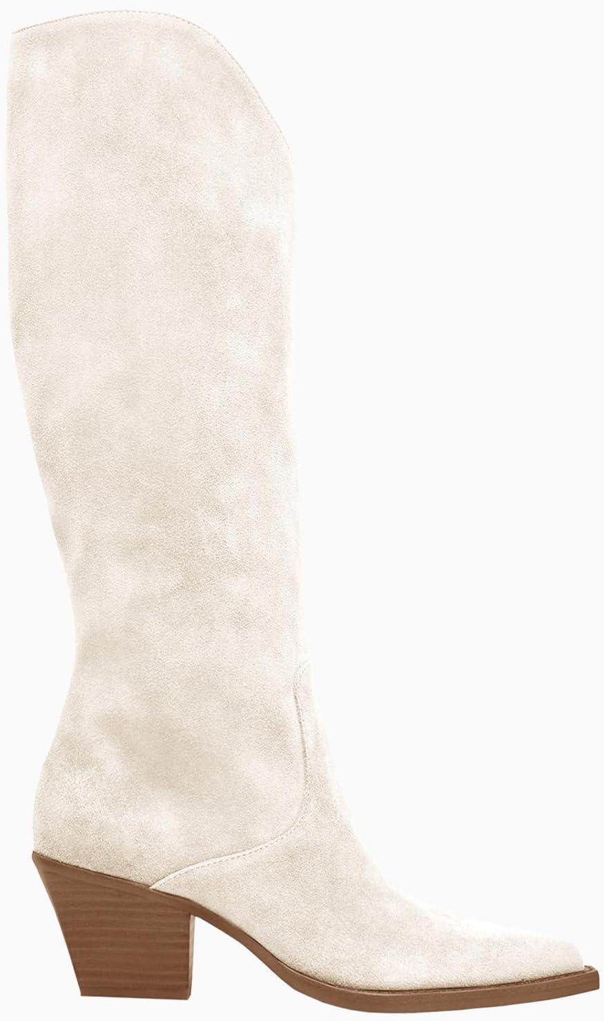 Coutgo Womens Wide Calf Cowboy Boots Suede Knee High Chunky Heel Pointed Toe Western Cowgirl Boots(Beige)