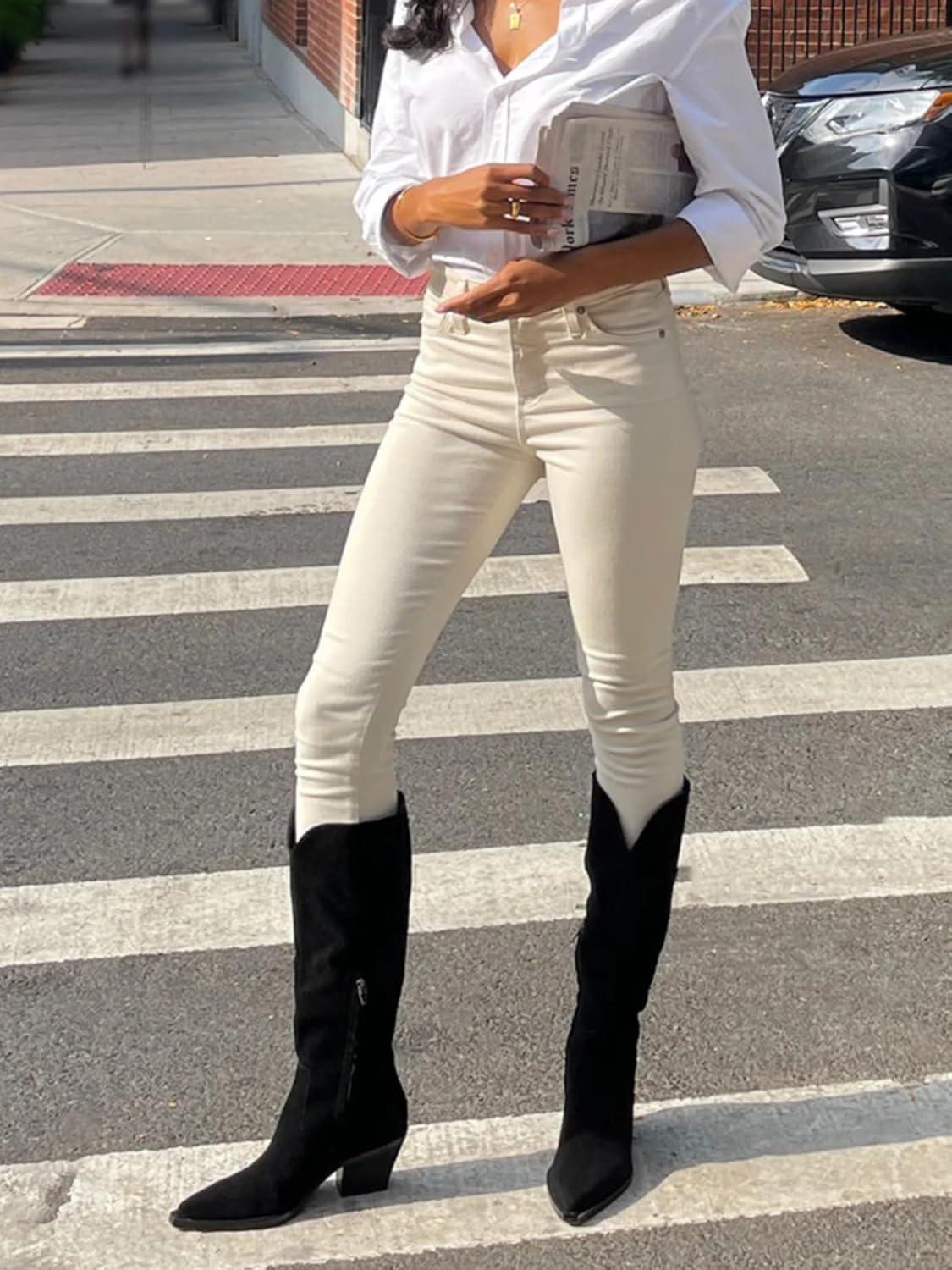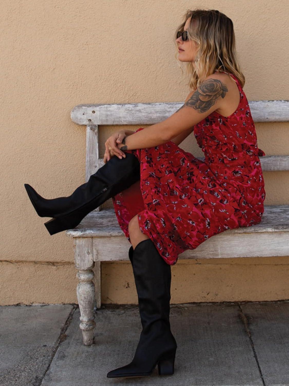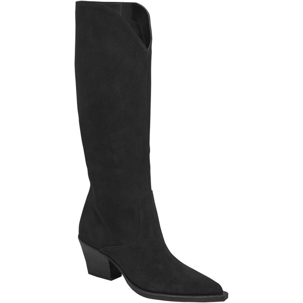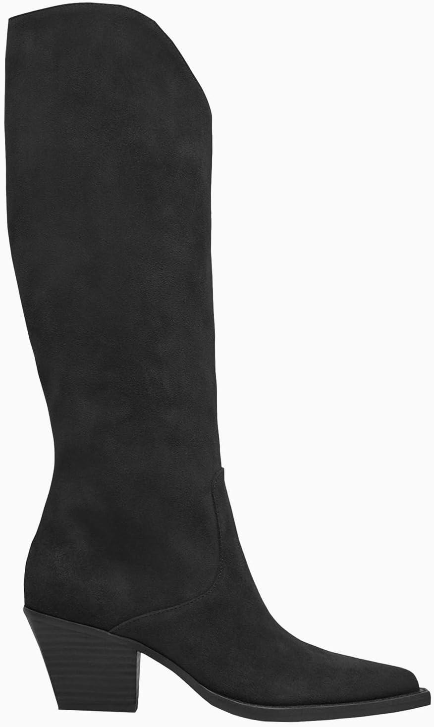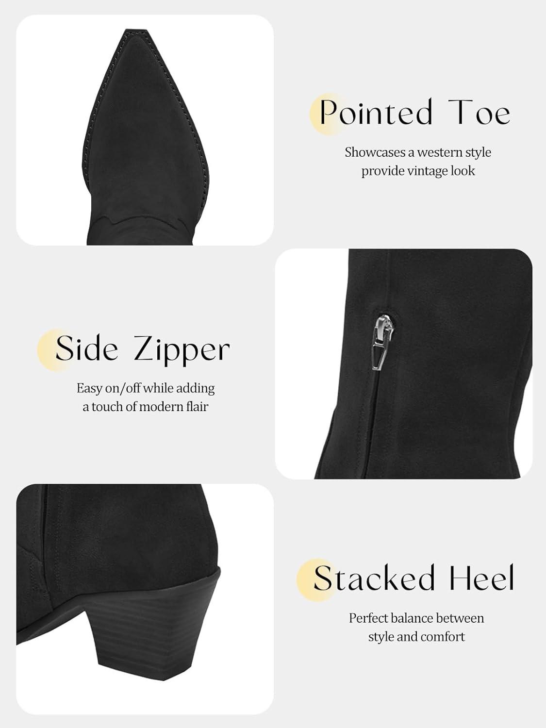 Coutgo Womens Wide Calf Cowboy Boots Suede Knee High Chunky Heel Pointed Toe Western Cowgirl Boots(Black)
