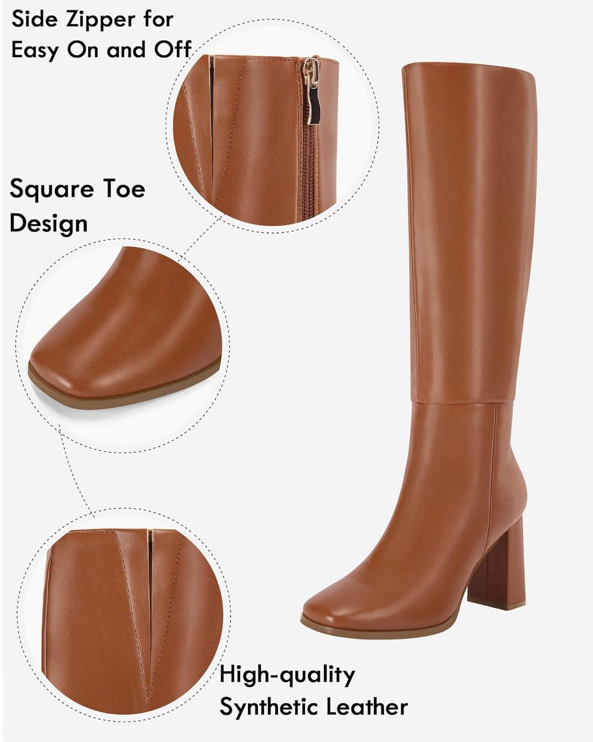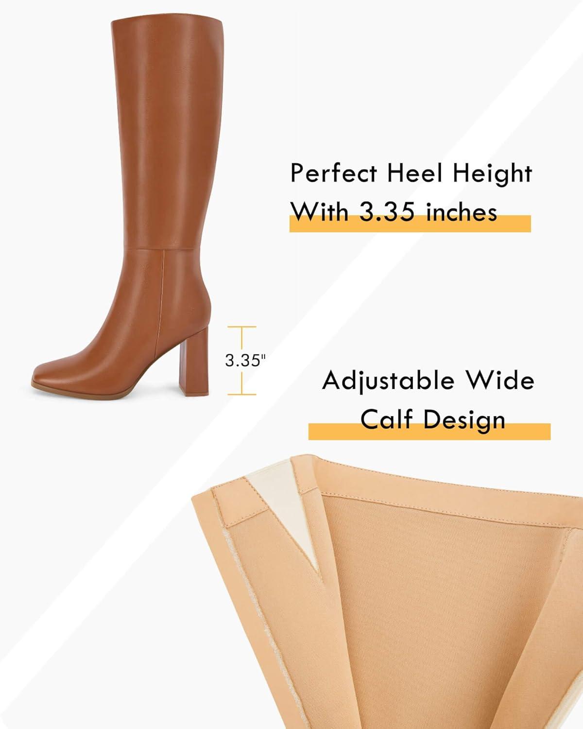 Coutgo Womens Wide Calf Knee High Boots Chunky High Heel Square Toe Fashion Leather Shoes with Side Zipper(Dark Brown)