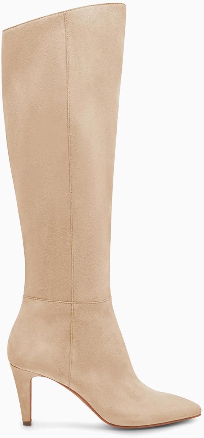 Coutgo Womens Wide Calf Knee High Boots Stiletto High Heel Pointed Toe Side Zipper Suede Long Boots Winter Shoes(Khaki)