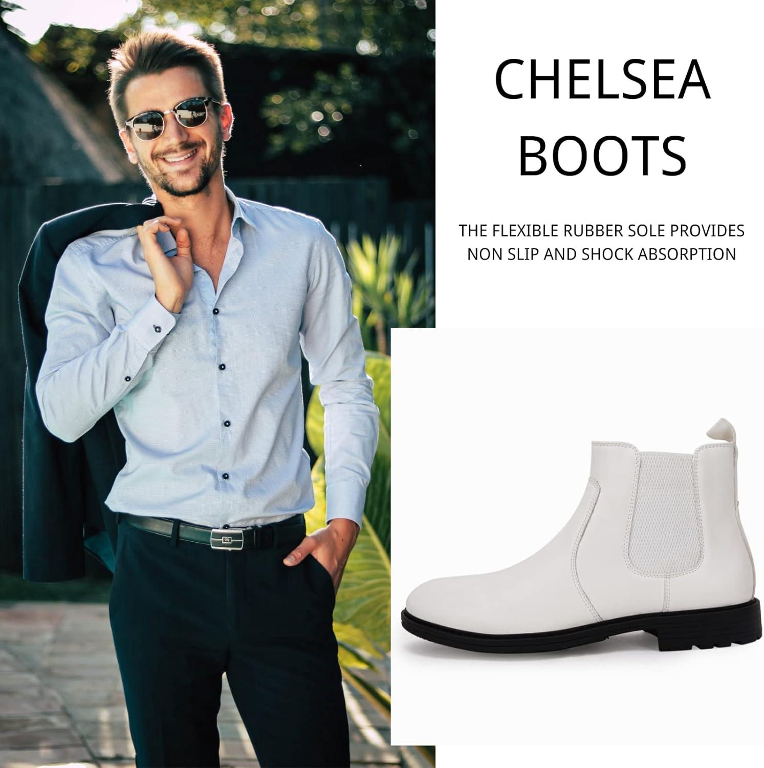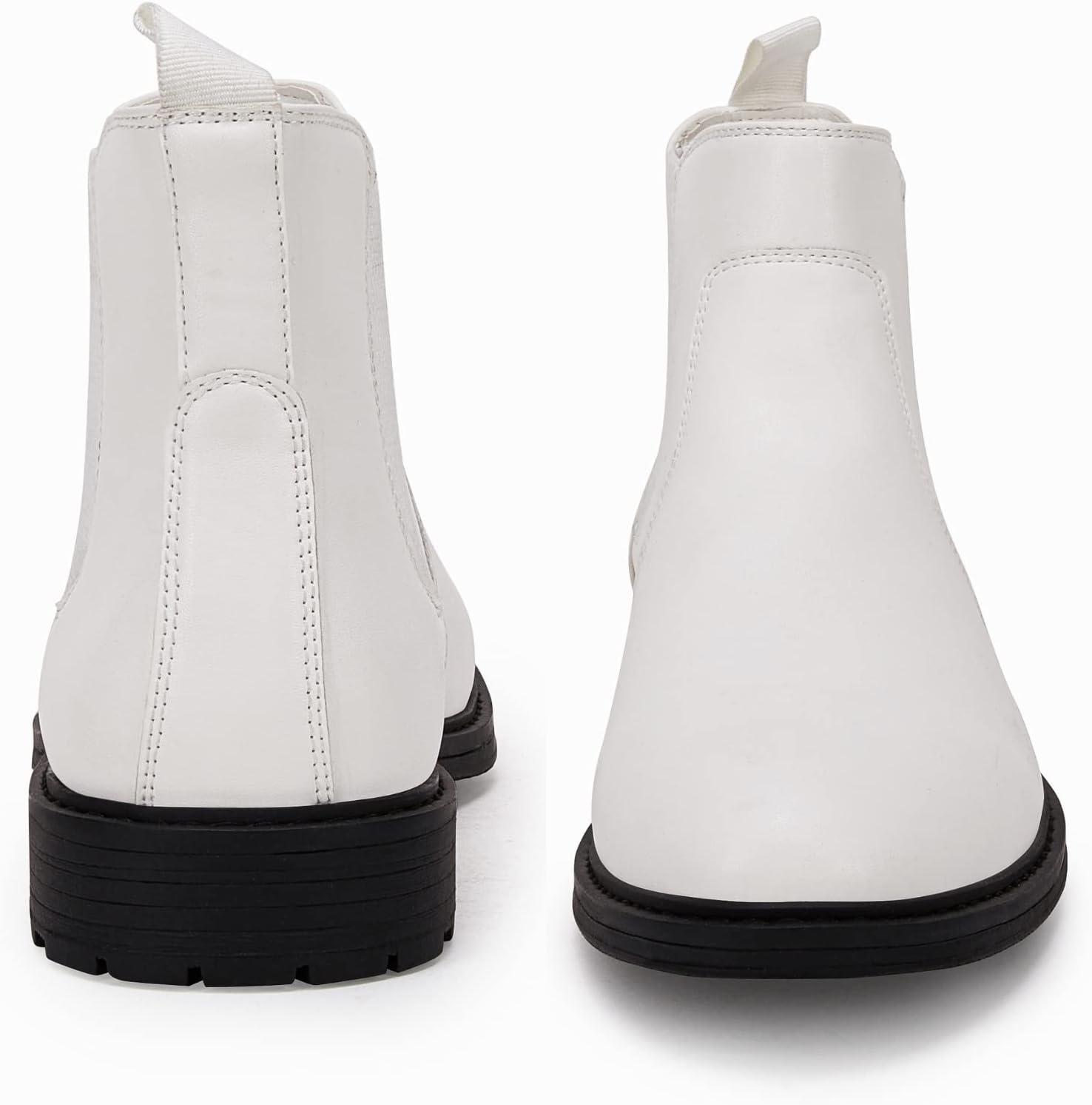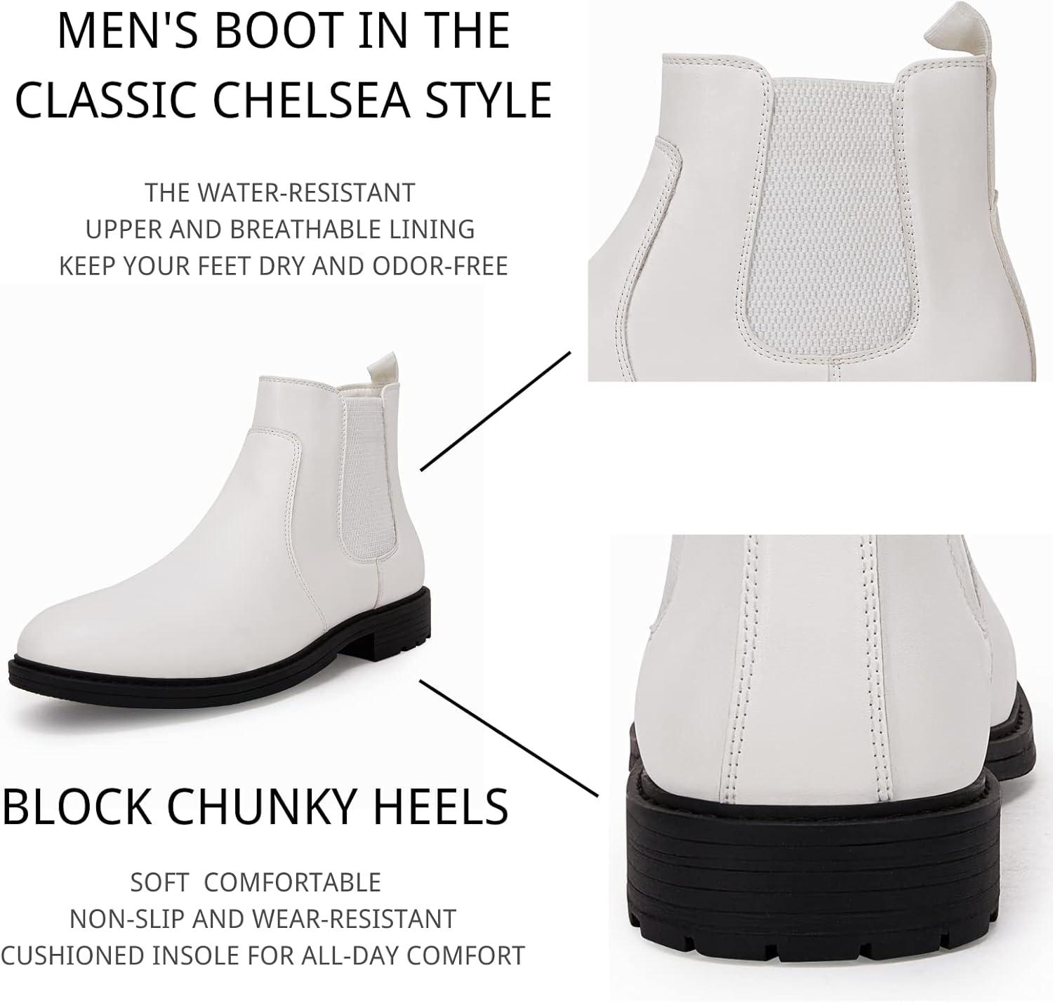 Men’s Ankle Boots Chelsea Round Toe Slip on Waterproof Faux Leather Classic Dress Booties for Men(White)