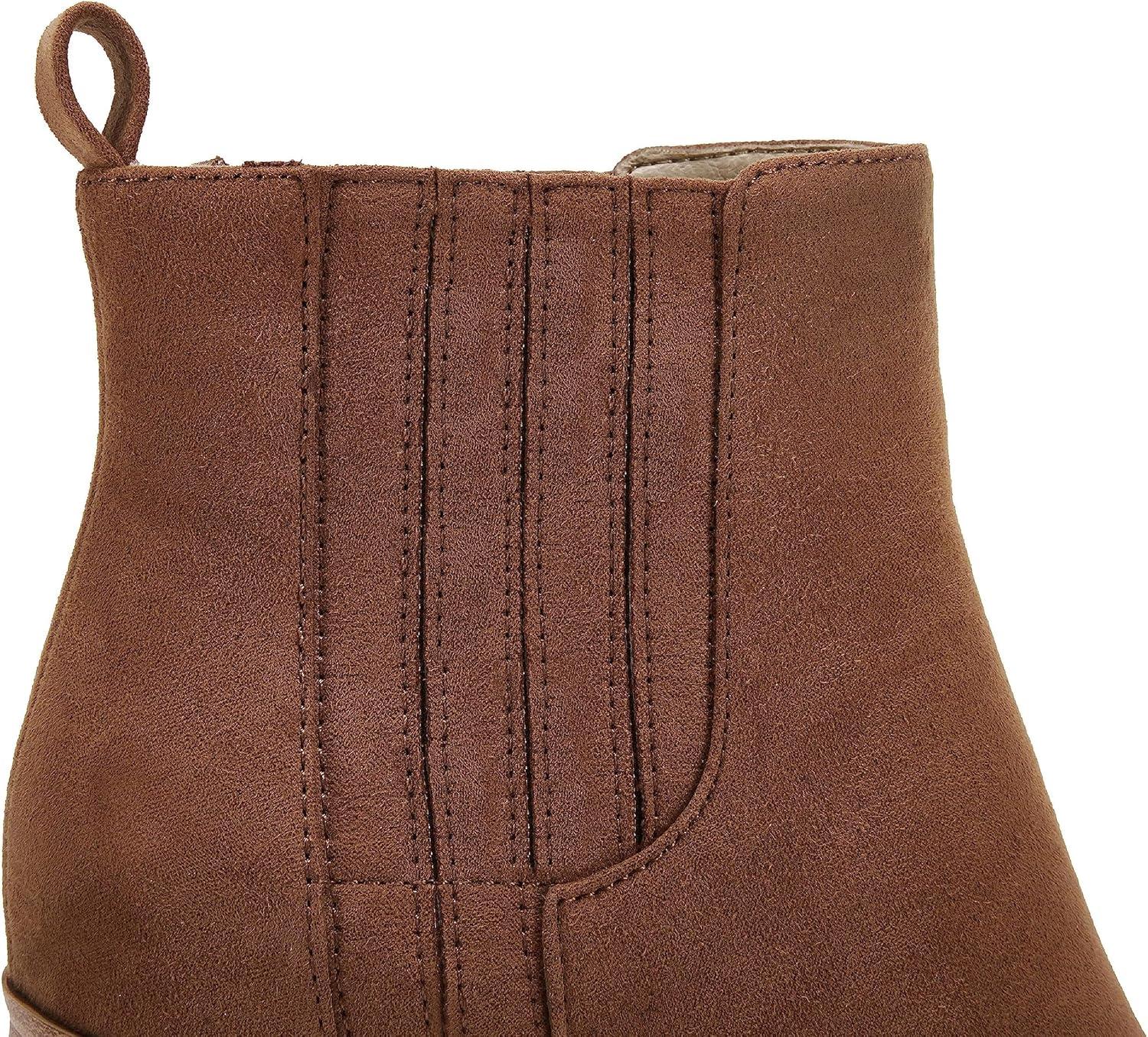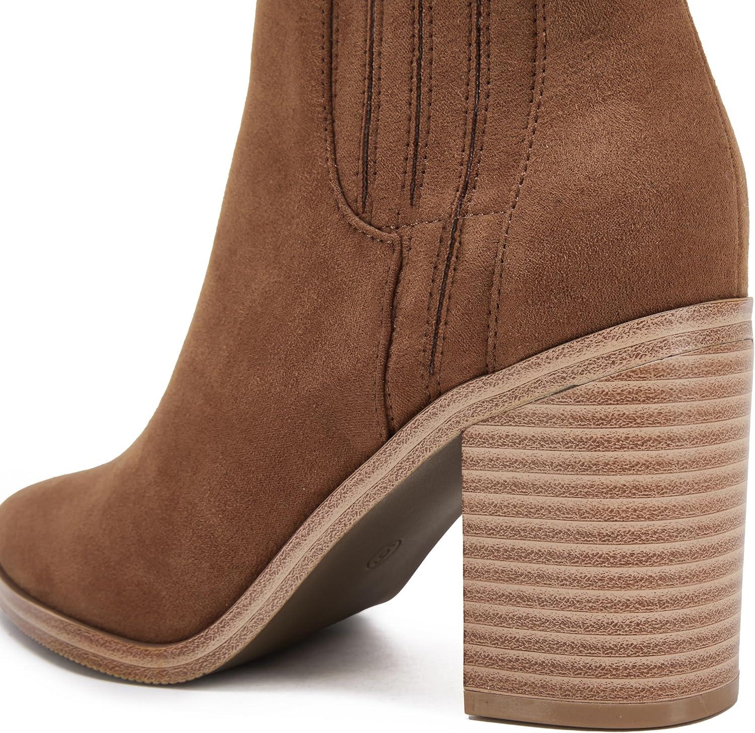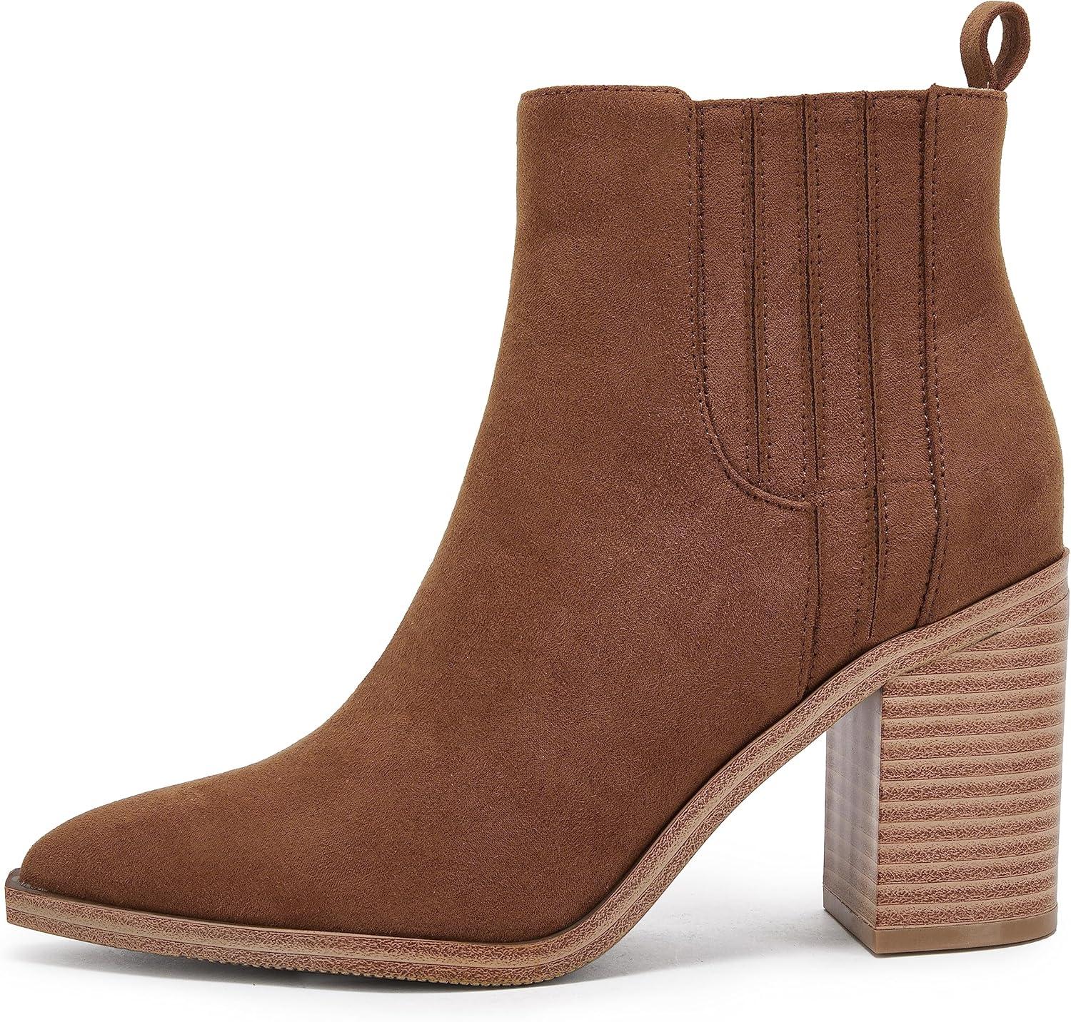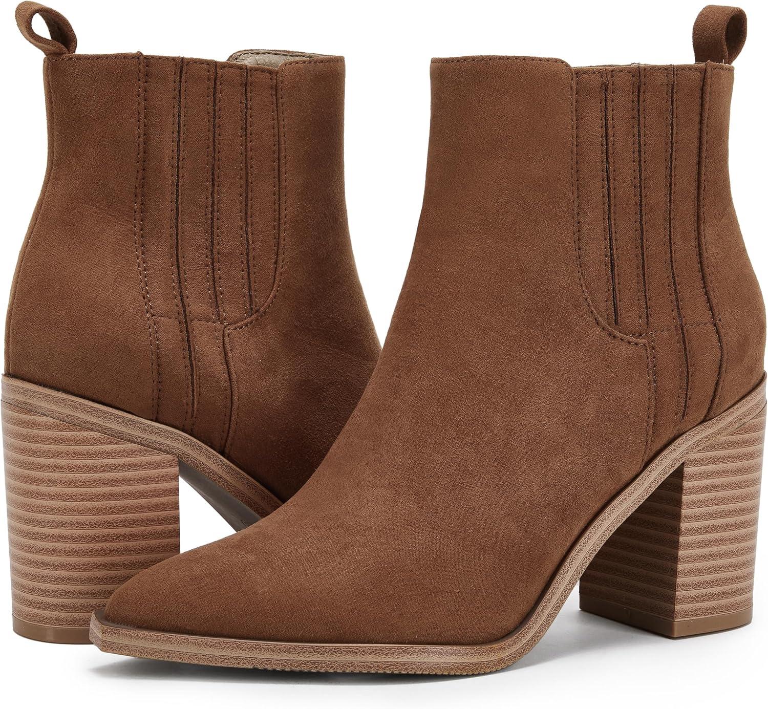 Womens Ankle Boots Slip on Pointed Toe Chunky Block Mid Heel Leather Elastic Panel Casual Chelsea Western Booties(Brown)
