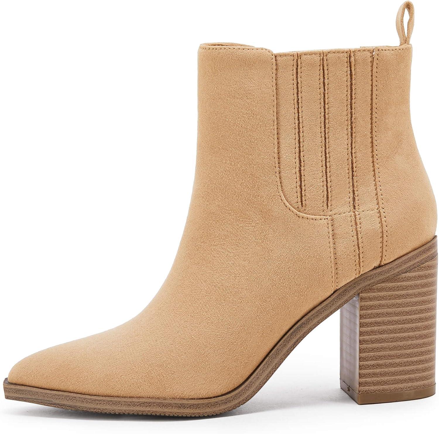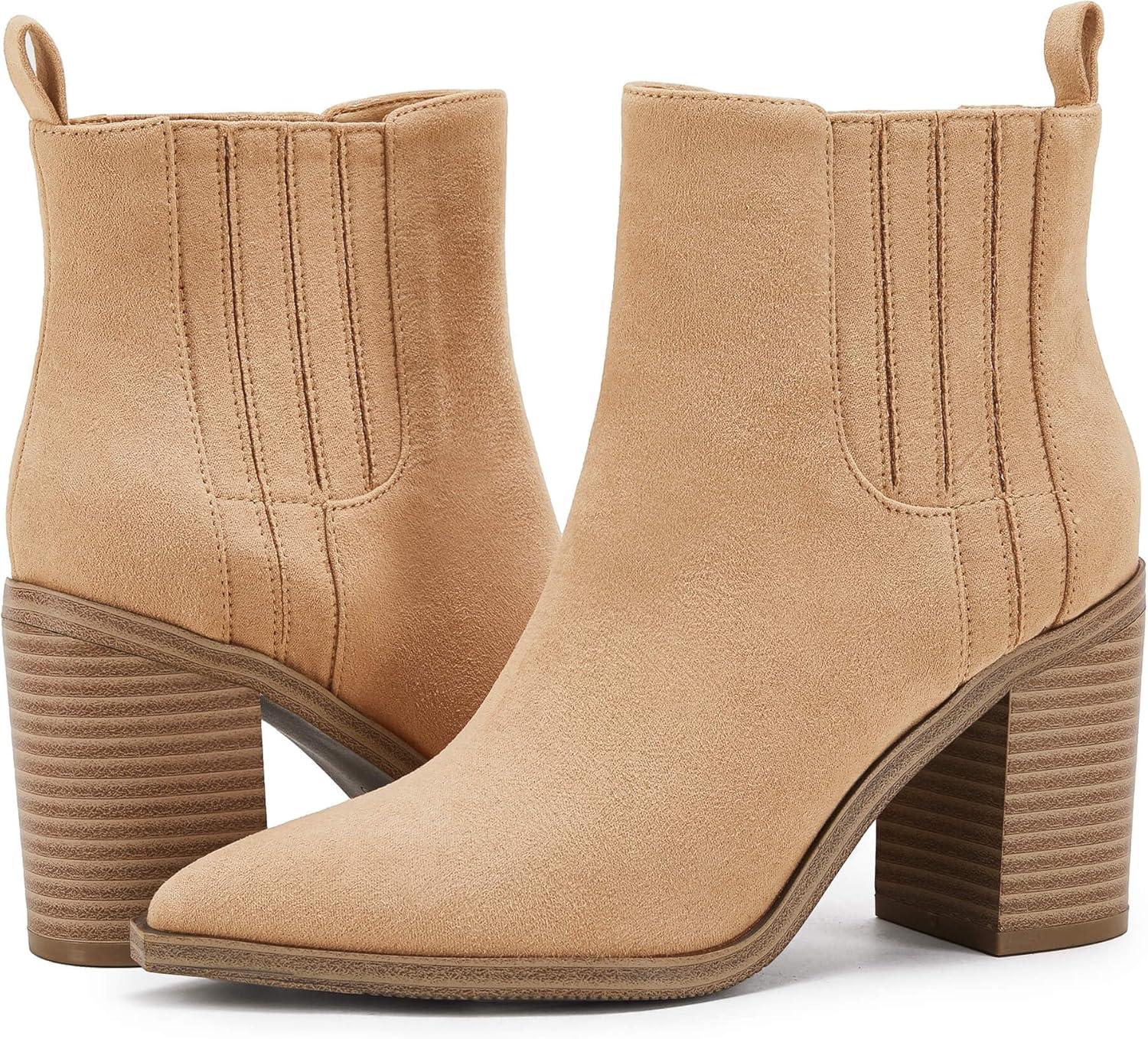 Don’t break the bank! Get the Womens Ankle Boots Slip on Pointed Toe Chunky Block Mid Heel Leather Elastic Panel Casual Chelsea Western Booties(Camel) you want at a price you can afford during our markdown sale.