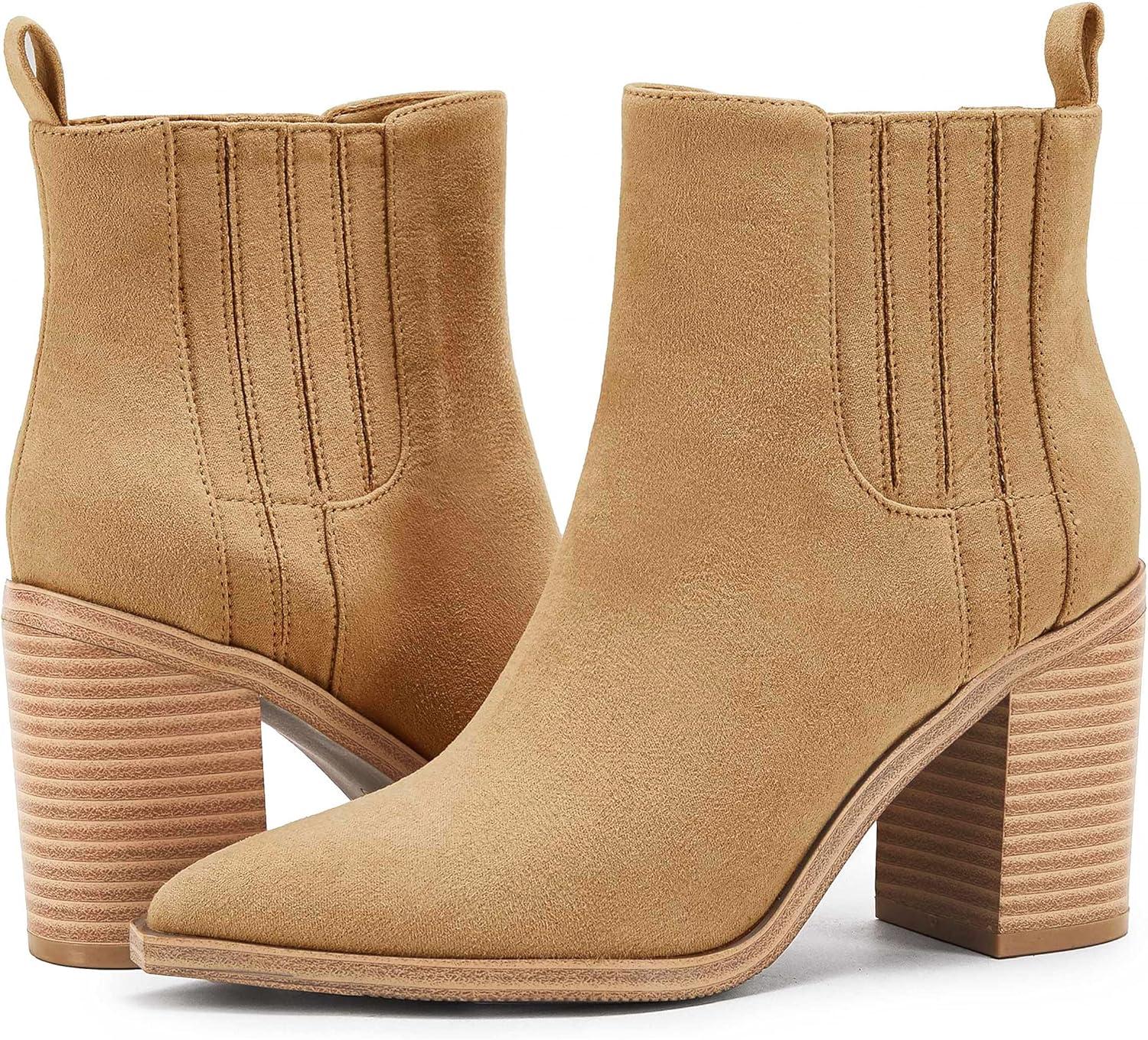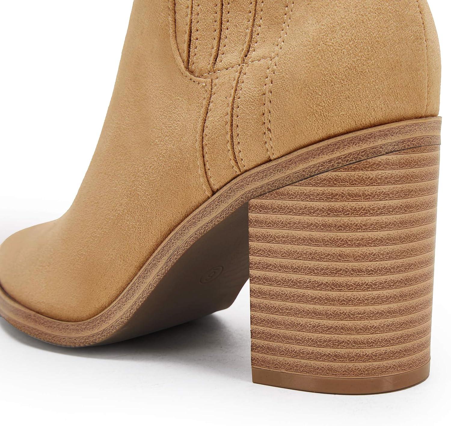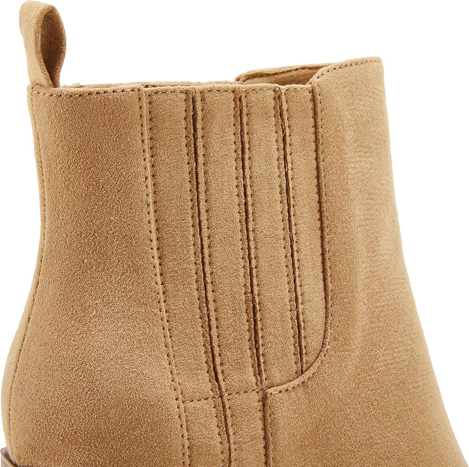 Womens Ankle Boots Slip on Pointed Toe Chunky Block Mid Heel Leather Elastic Panel Casual Chelsea Western Booties(Khaki)