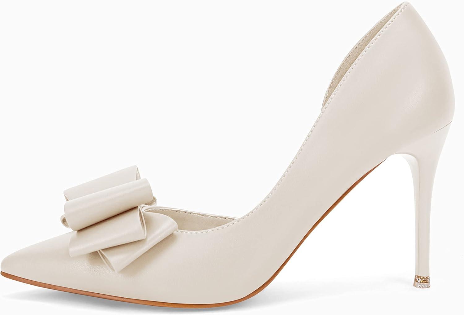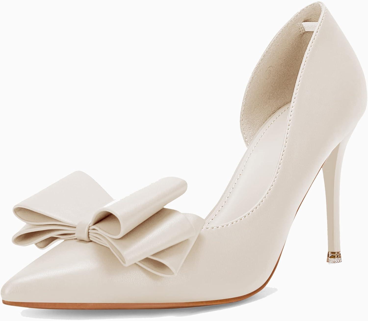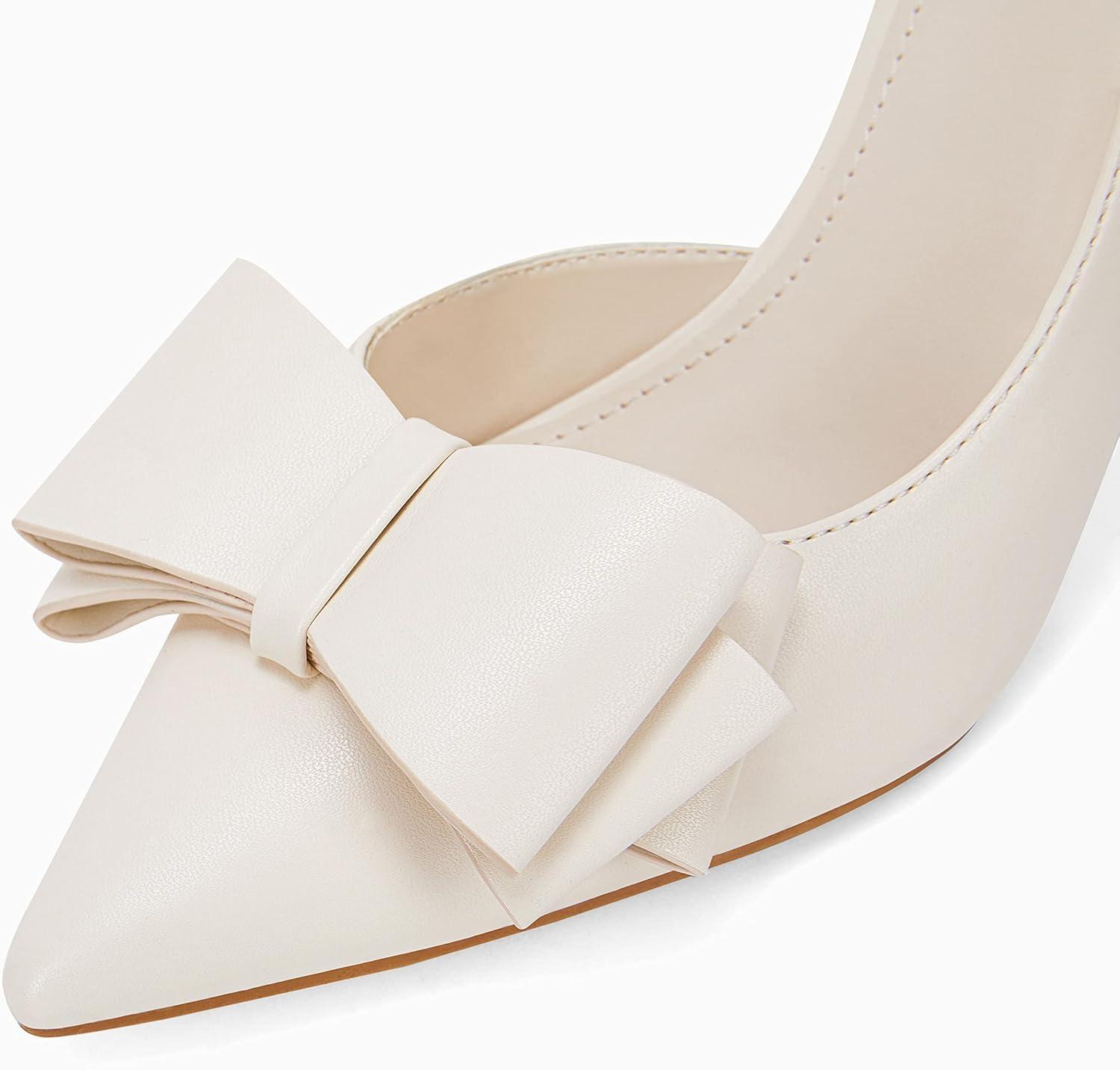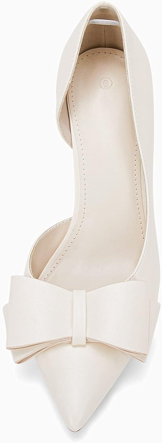 Womens Bow Heels Closed Pointed Toe Dress Shoes Stiletto Slip on Wedding Pumps(White)