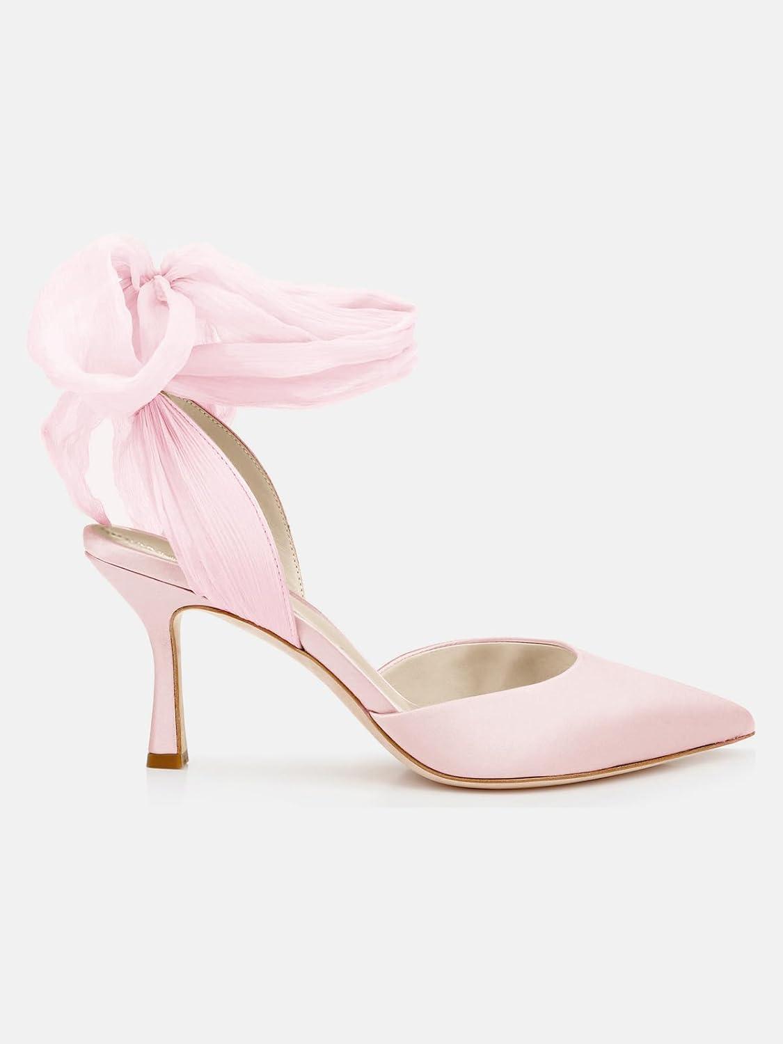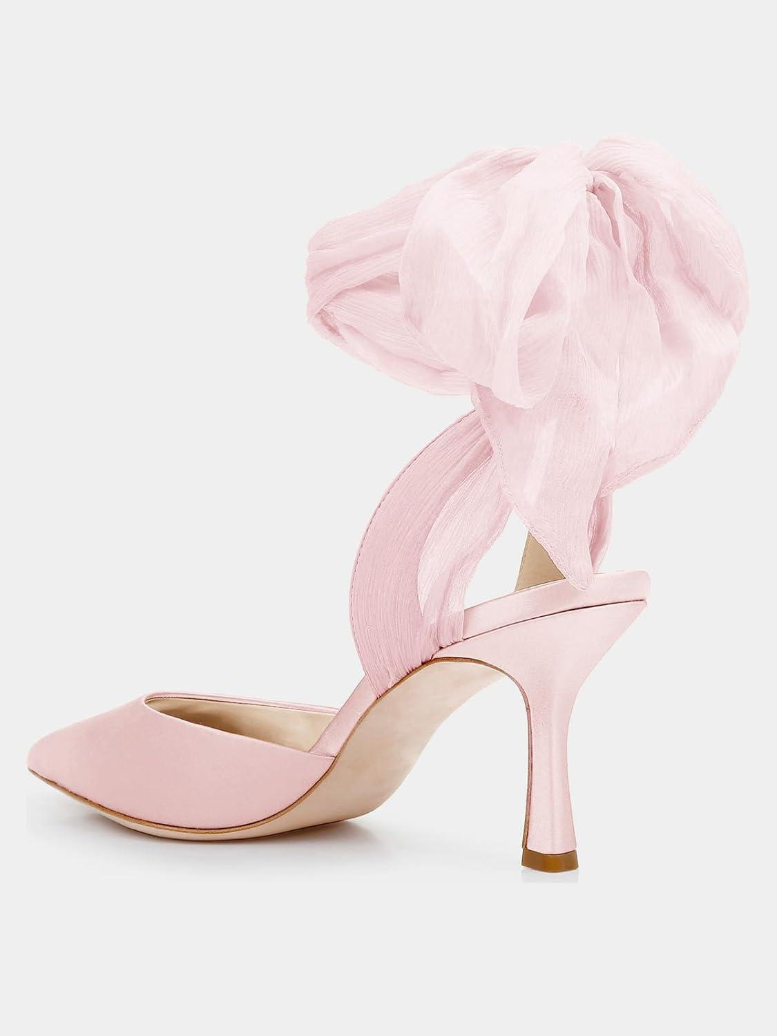 Womens Lace up Satin Heels Bow Pointed Closed Toe Bridal Dress Shoes Low Heel Wedding Elegant Pumps(Pink)