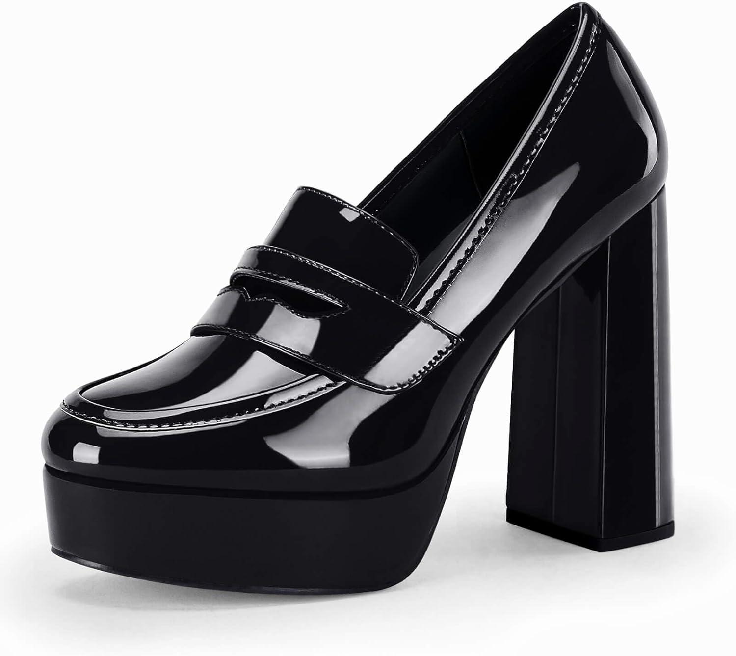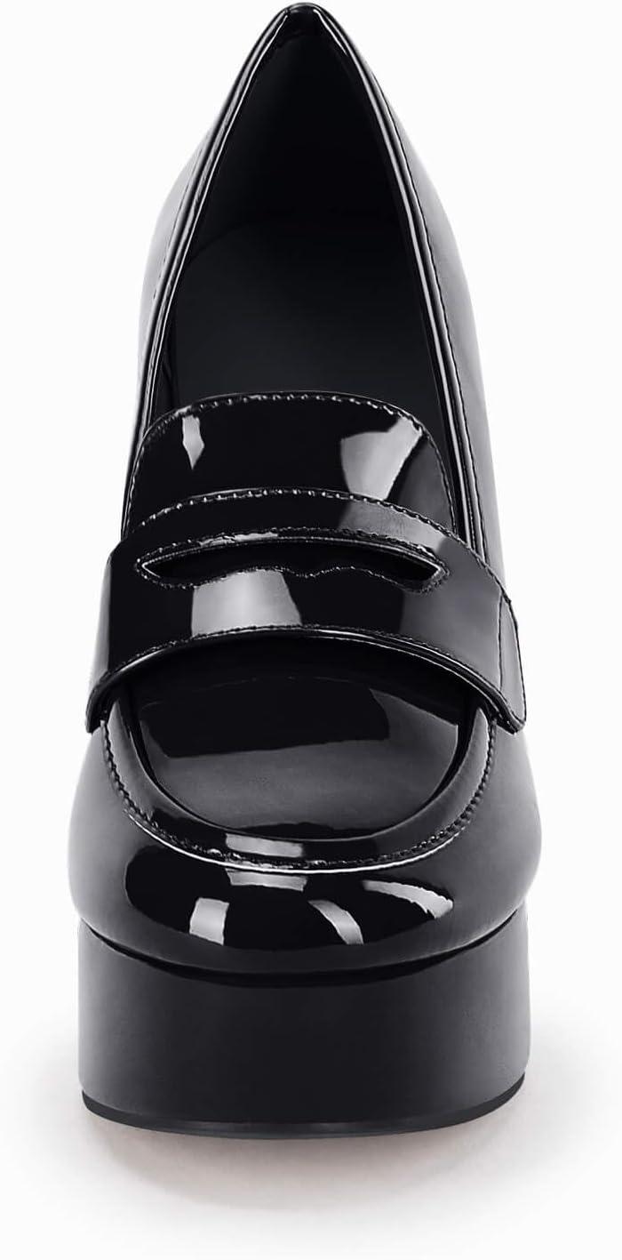 Womens Platform Heels Loafers Chunky High Heel Closed Toe Patent Leather Shoes Penny Loafer Business Dress Work Pumps(Black)